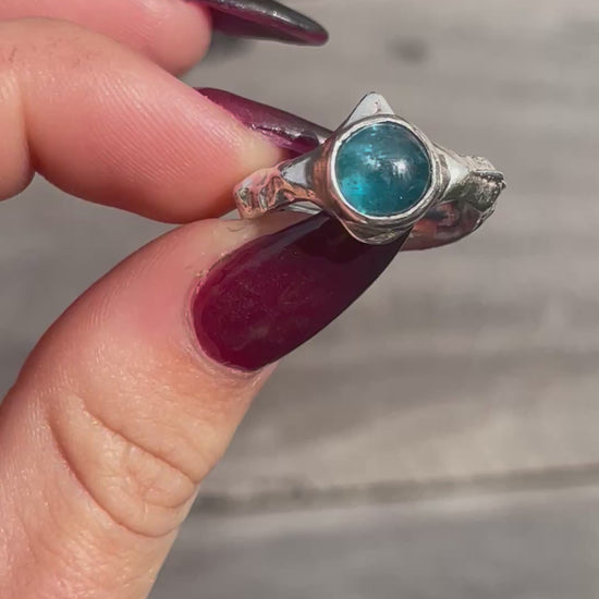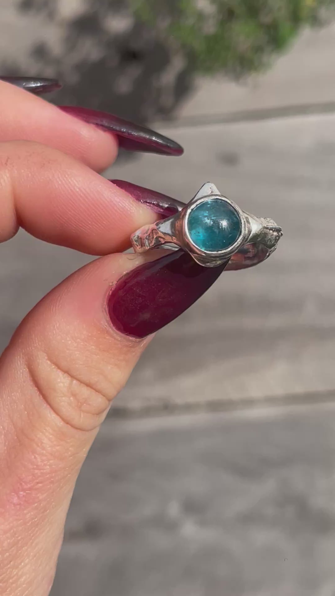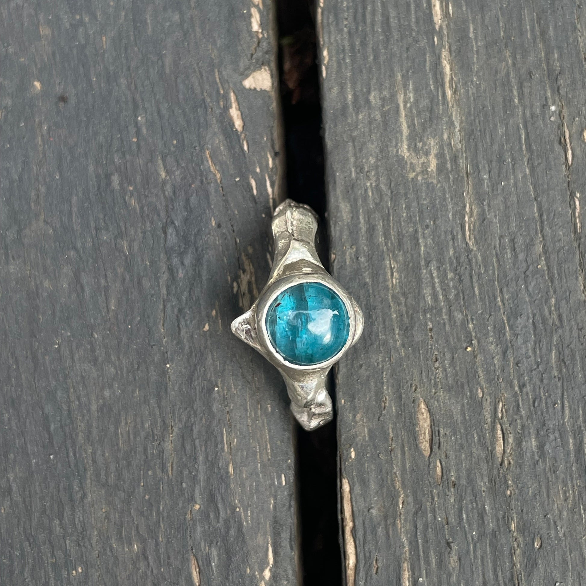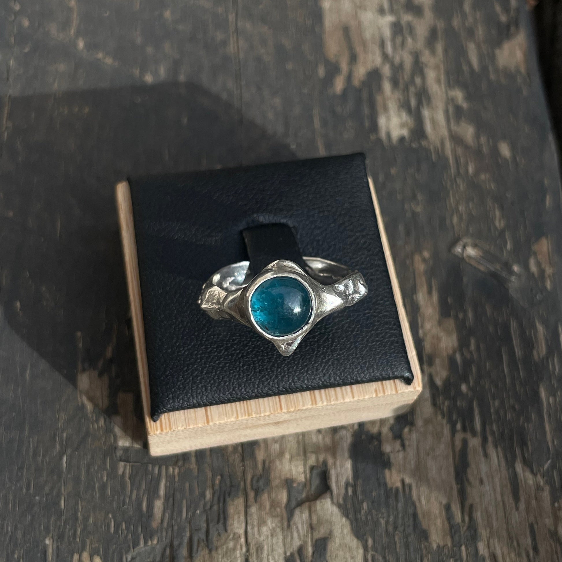 A textured 925 sterling silver band featuring a vibrant blue kyanite stone, its natural striations catching the light with every movement. Sleek and versatile, this ring sits beautifully on its own or stacked with others. Perfect for those who love a pop of colour with a touch of effortless elegance.