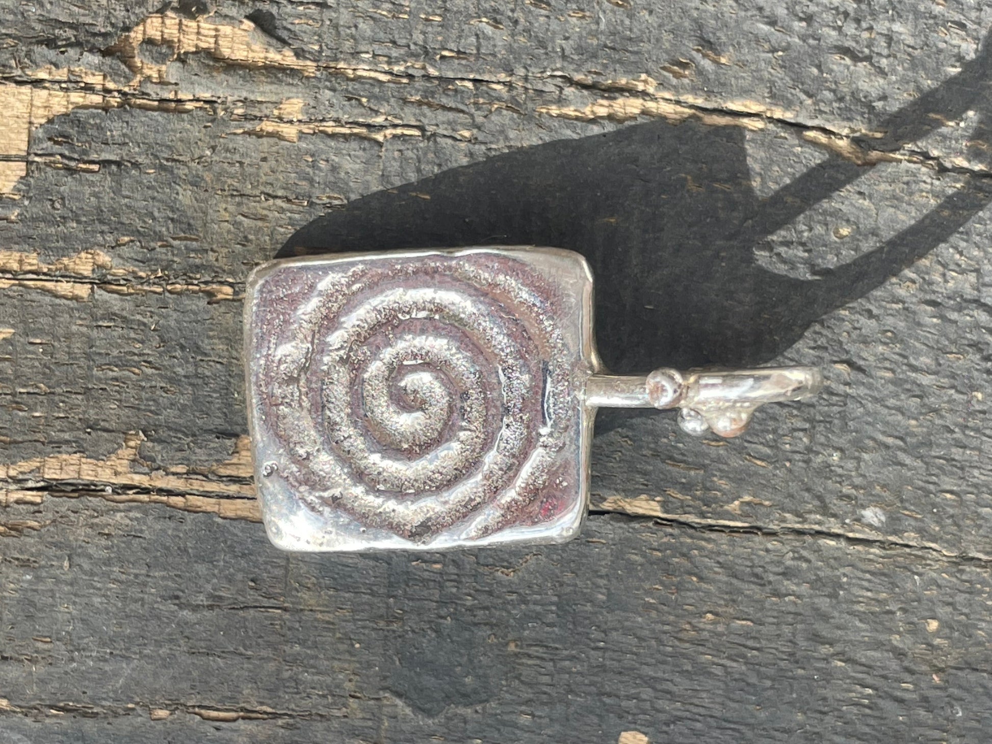 On the other side features a swirl. Swirls symbolise movement, growth, and the cycles of life, making this piece a reminder of the energy and rhythm that shape the world. Wear it either side up for two distinct expressions of vibration and form.