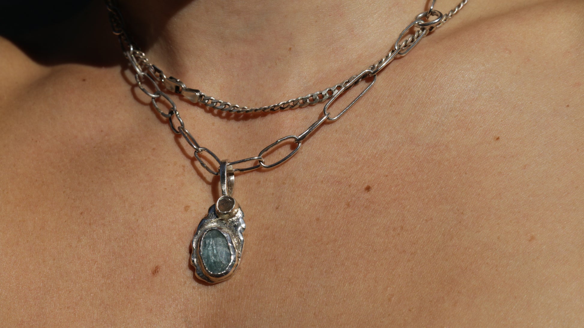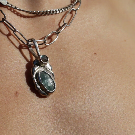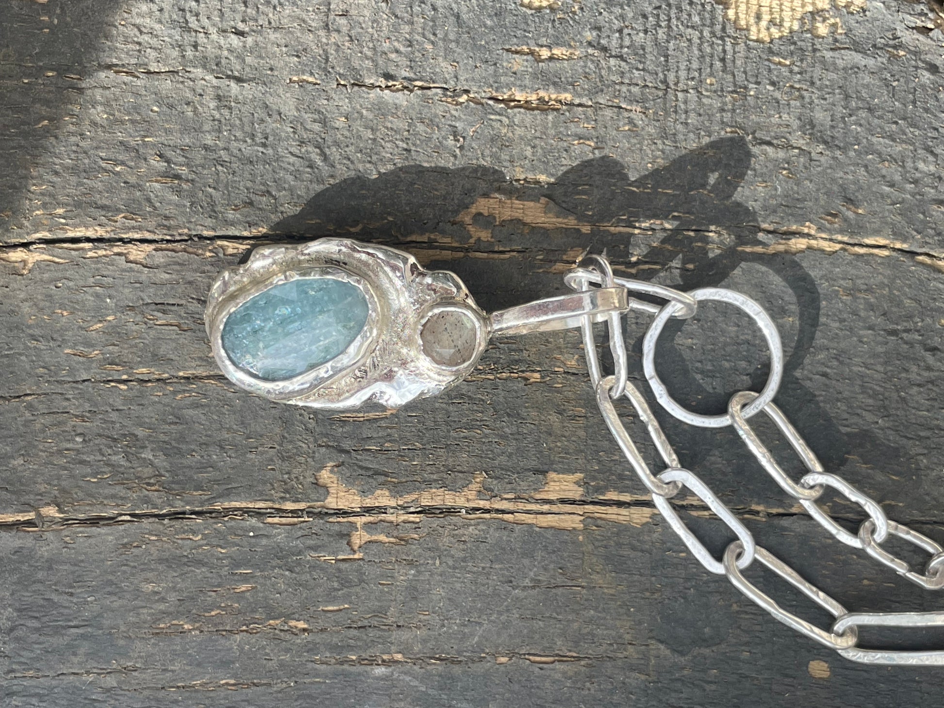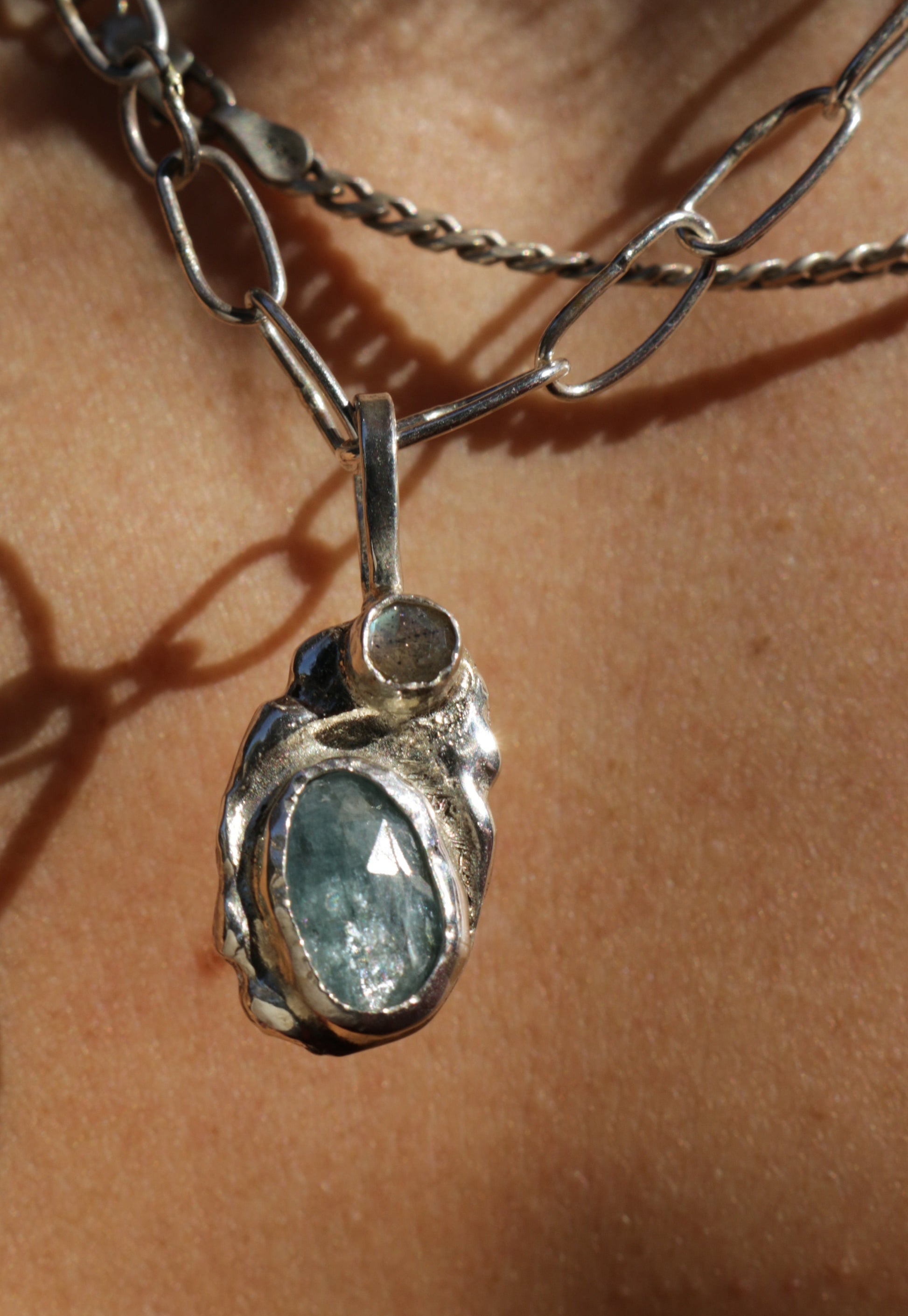 Labradorite and kyanite pendent, and the back is carved with curves, ripples, and mountain-like textures, creating a tactile, detailed surface. It can be worn either side up, giving you two different looks in one pendant.