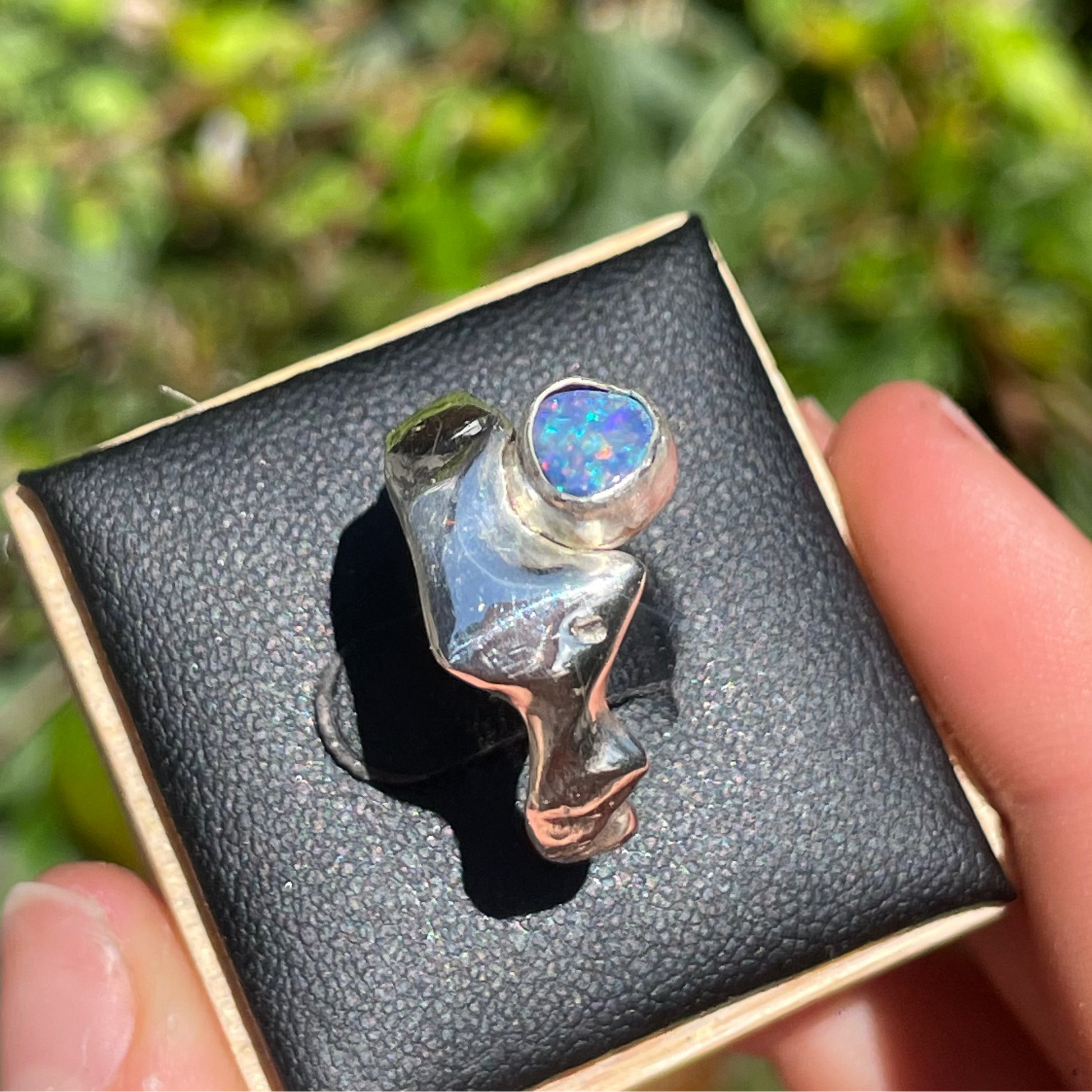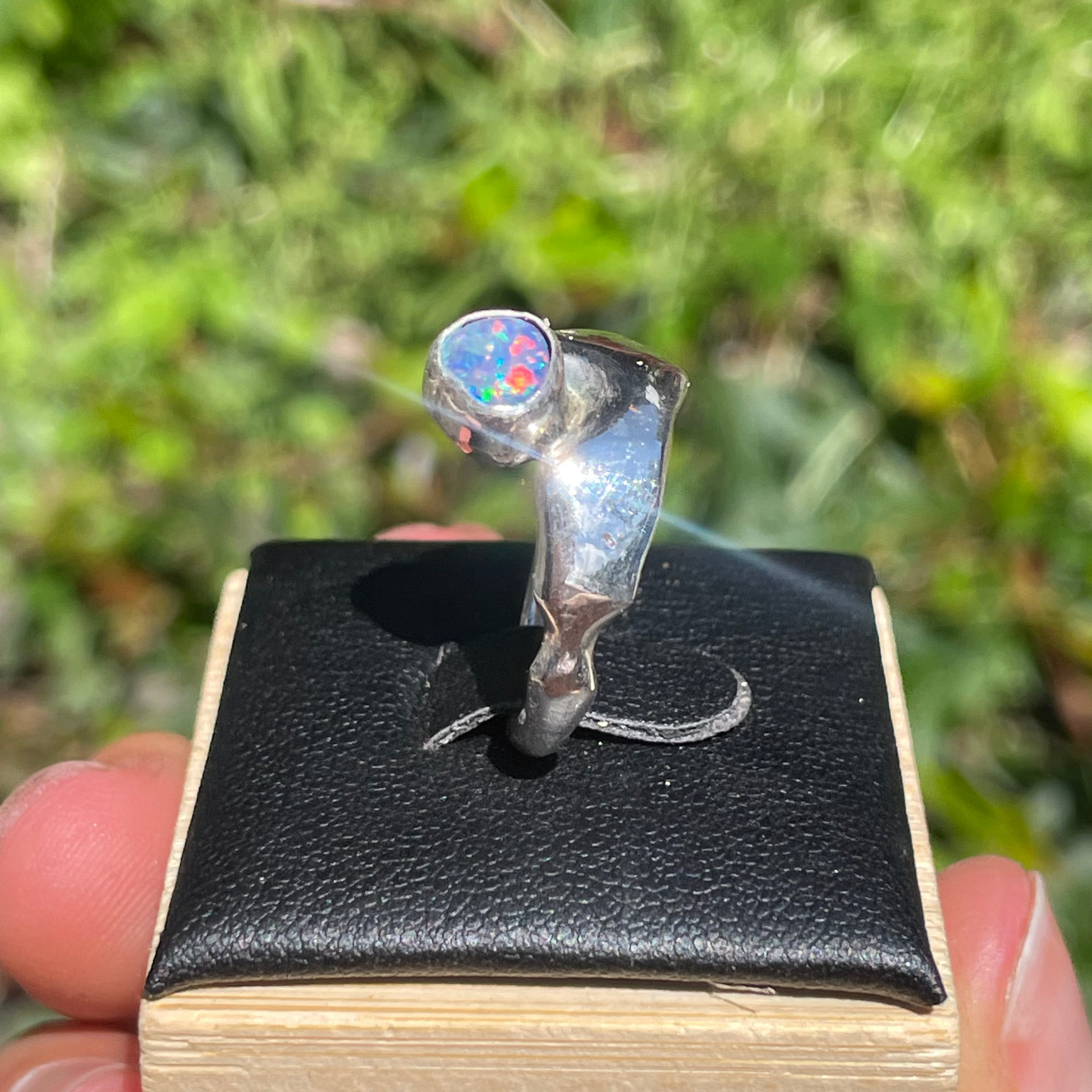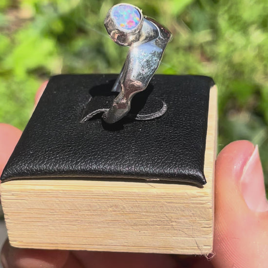 A molten, hand-carved 925 sterling silver ring wrapped around a vibrant, breathtaking opal, crafted to highlight the stone’s natural shimmer and depth.