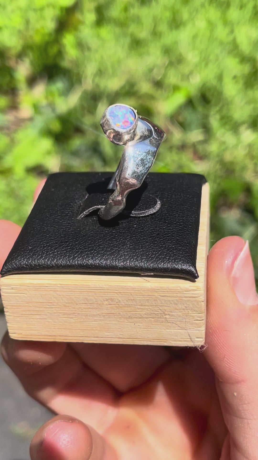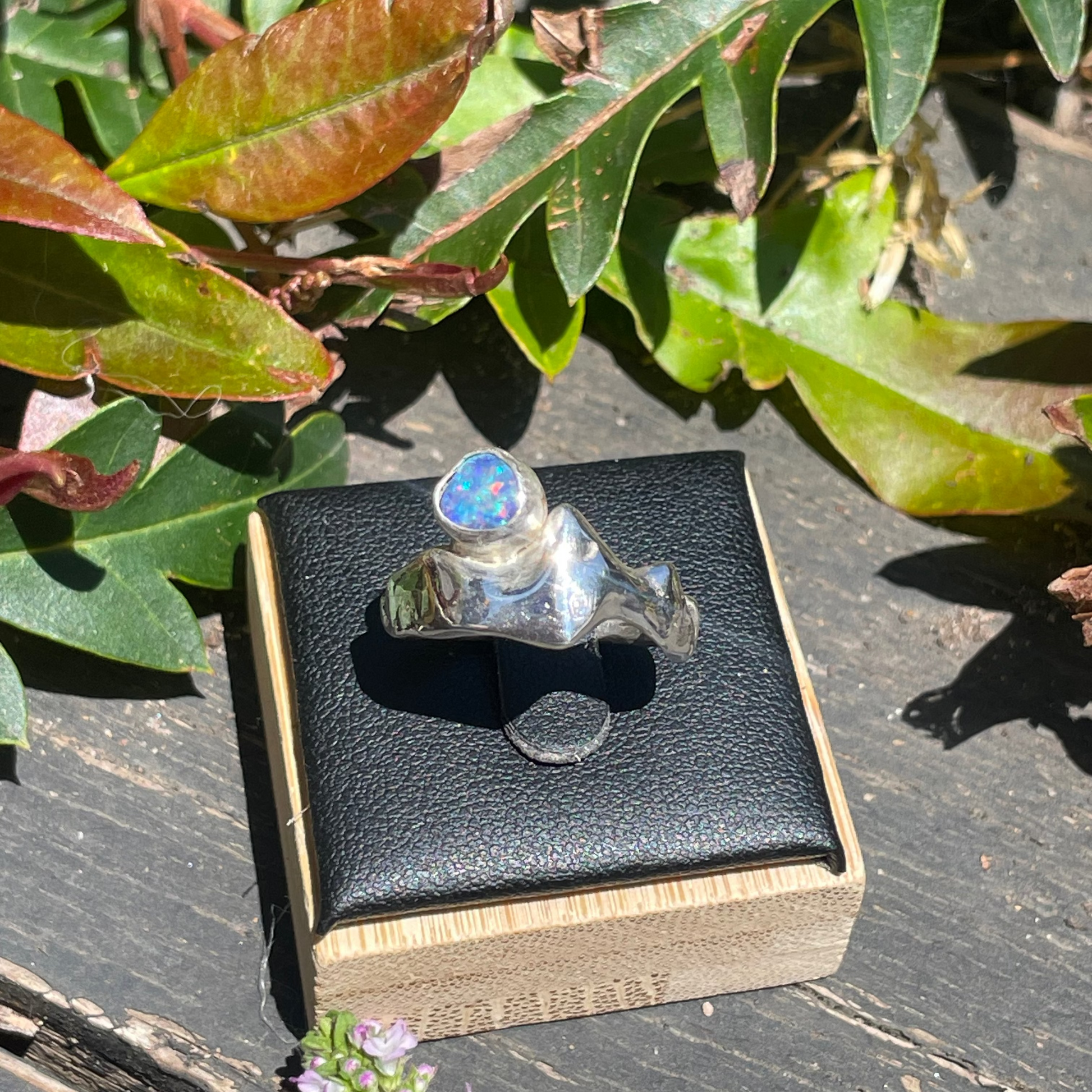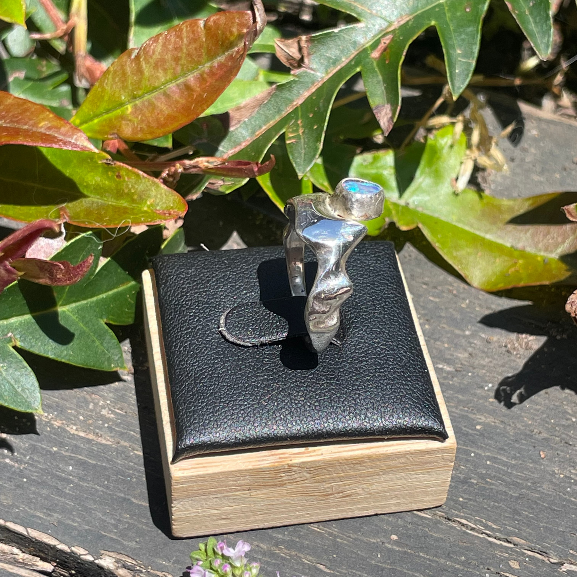 A molten, hand-carved 925 sterling silver ring wrapped around a vibrant, breathtaking opal, crafted to highlight the stone’s natural shimmer and depth.