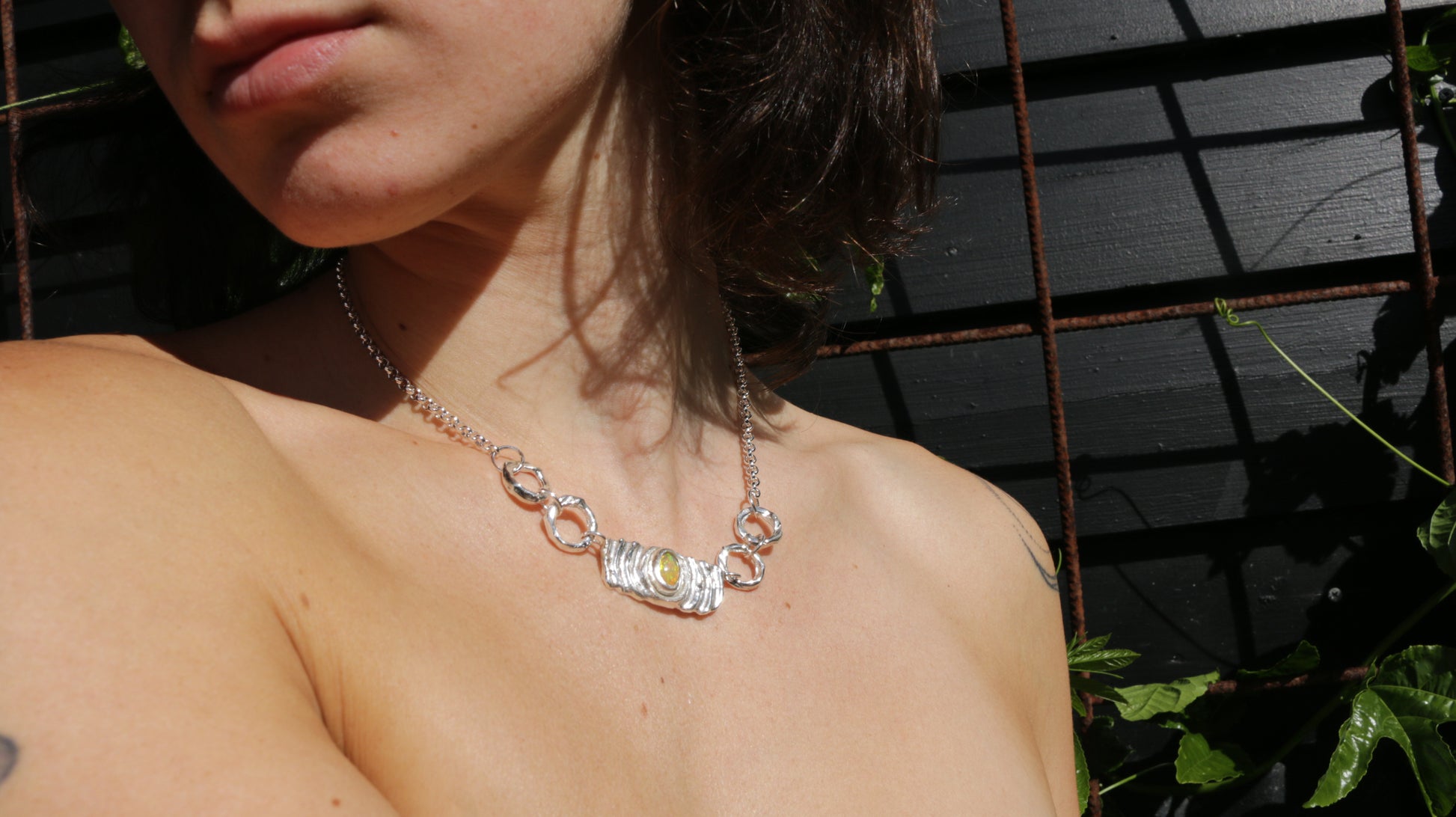 Each of the four circular links has been sand-cast individually, giving each one its own natural character. The centre element—where the opal rests—was hand-cast as well, with every ripple carved by hand to create a sculptural, fluid form that draws the eye straight to the stone.