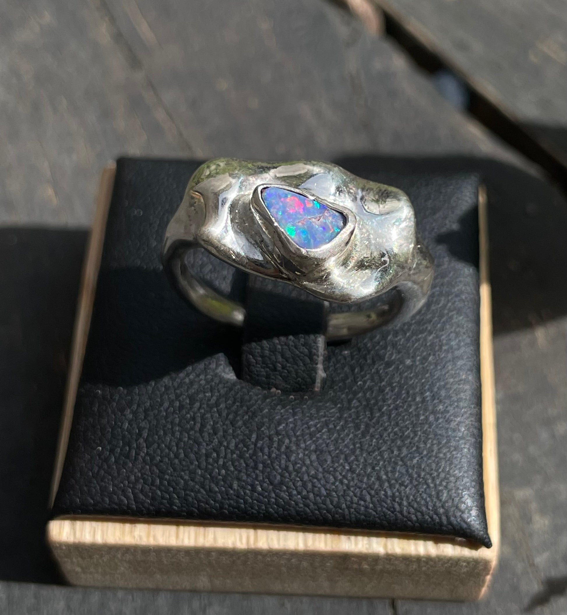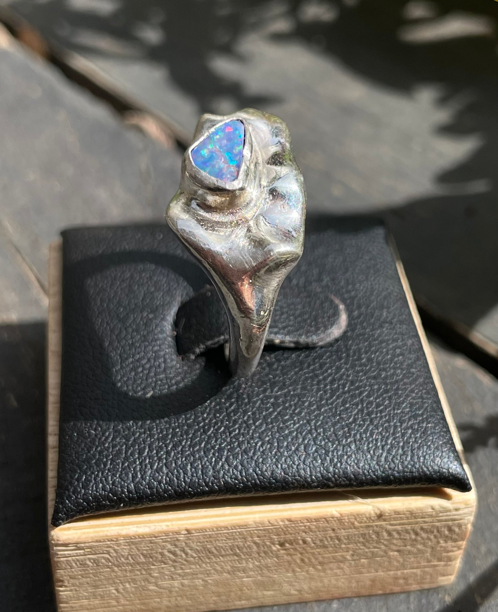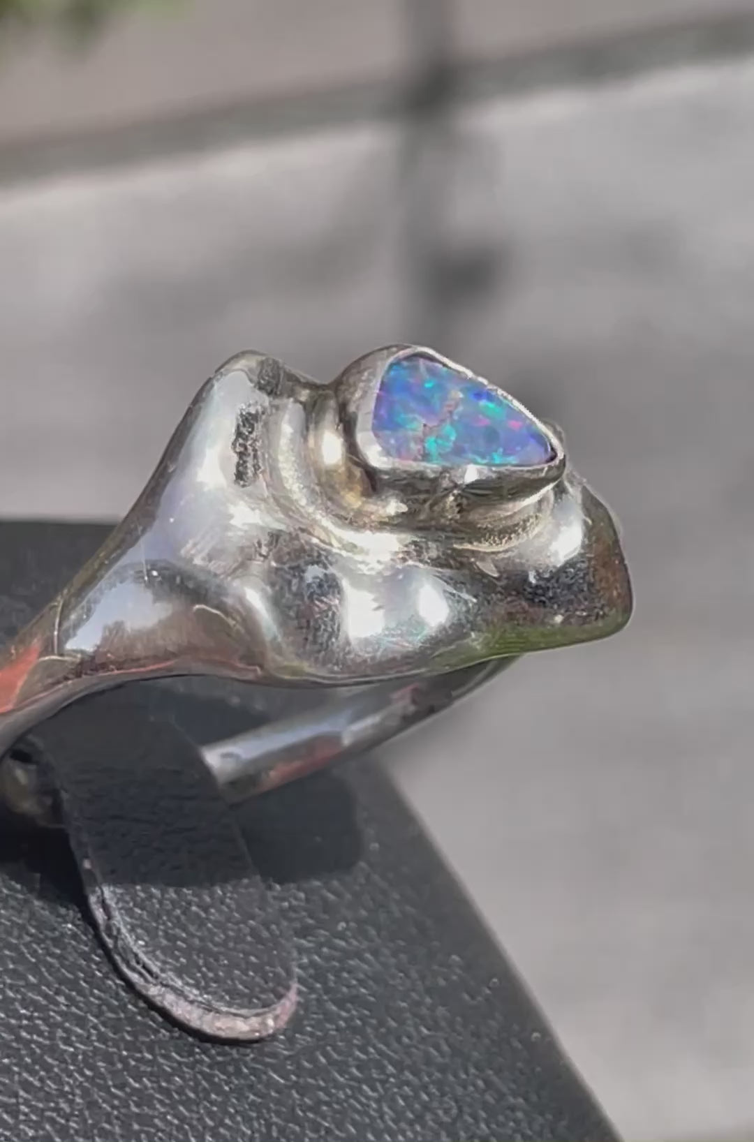 A radiant opal nestled in a flowing, sand-cast 925 sterling silver band. The organic curves mirror the stone’s natural energy, letting its fire shine brilliantly.
