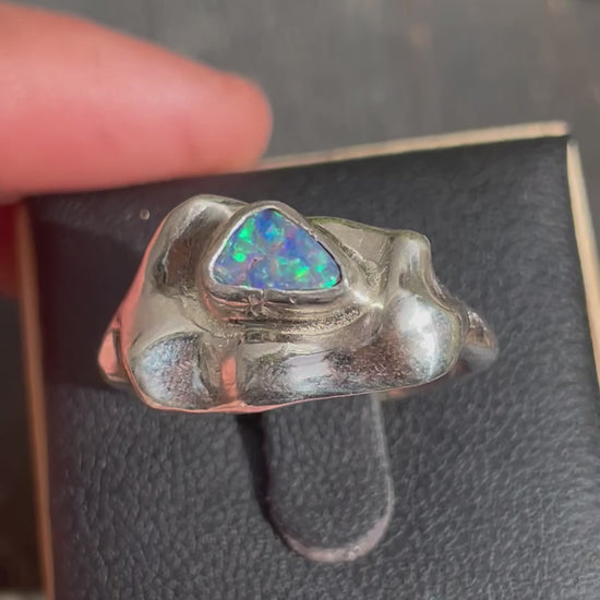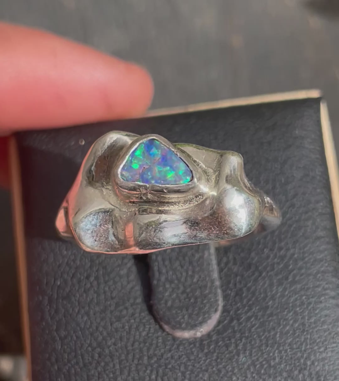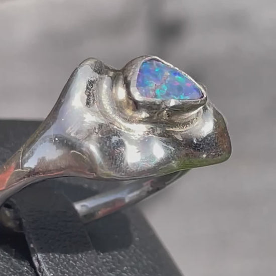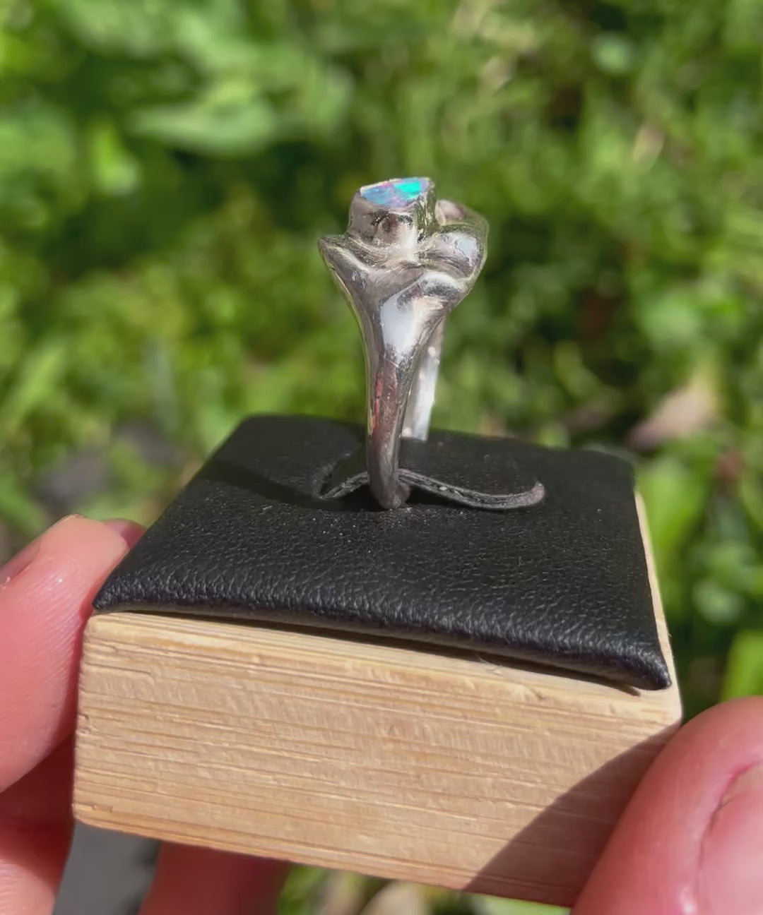 A radiant opal nestled in a flowing, sand-cast 925 sterling silver band. The organic curves mirror the stone’s natural energy, letting its fire shine brilliantly.