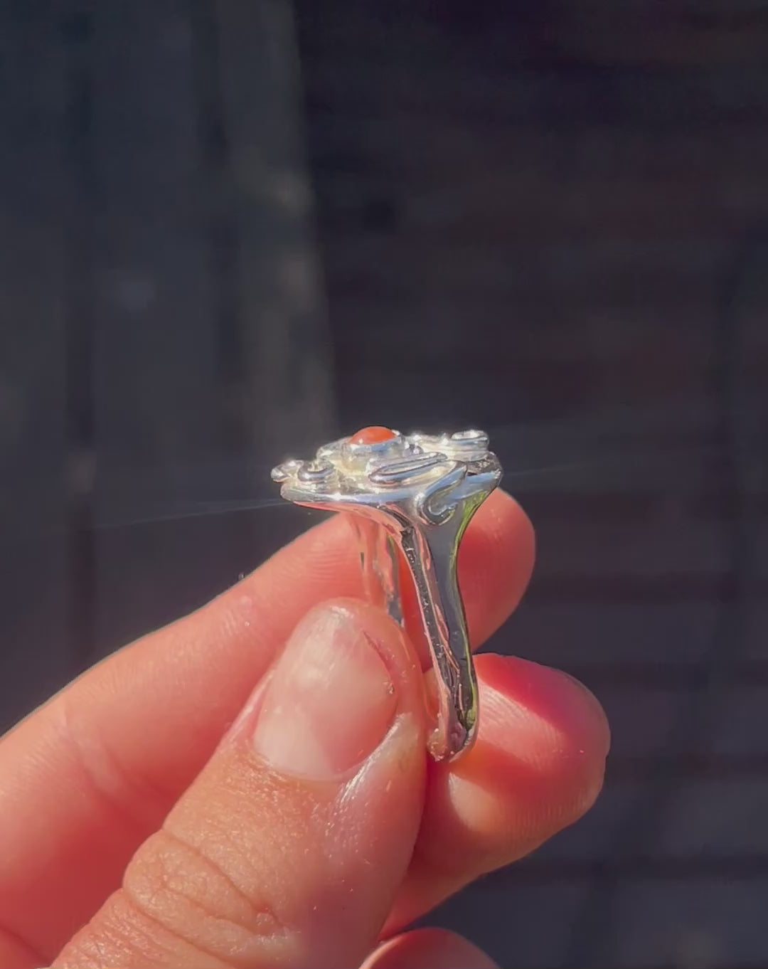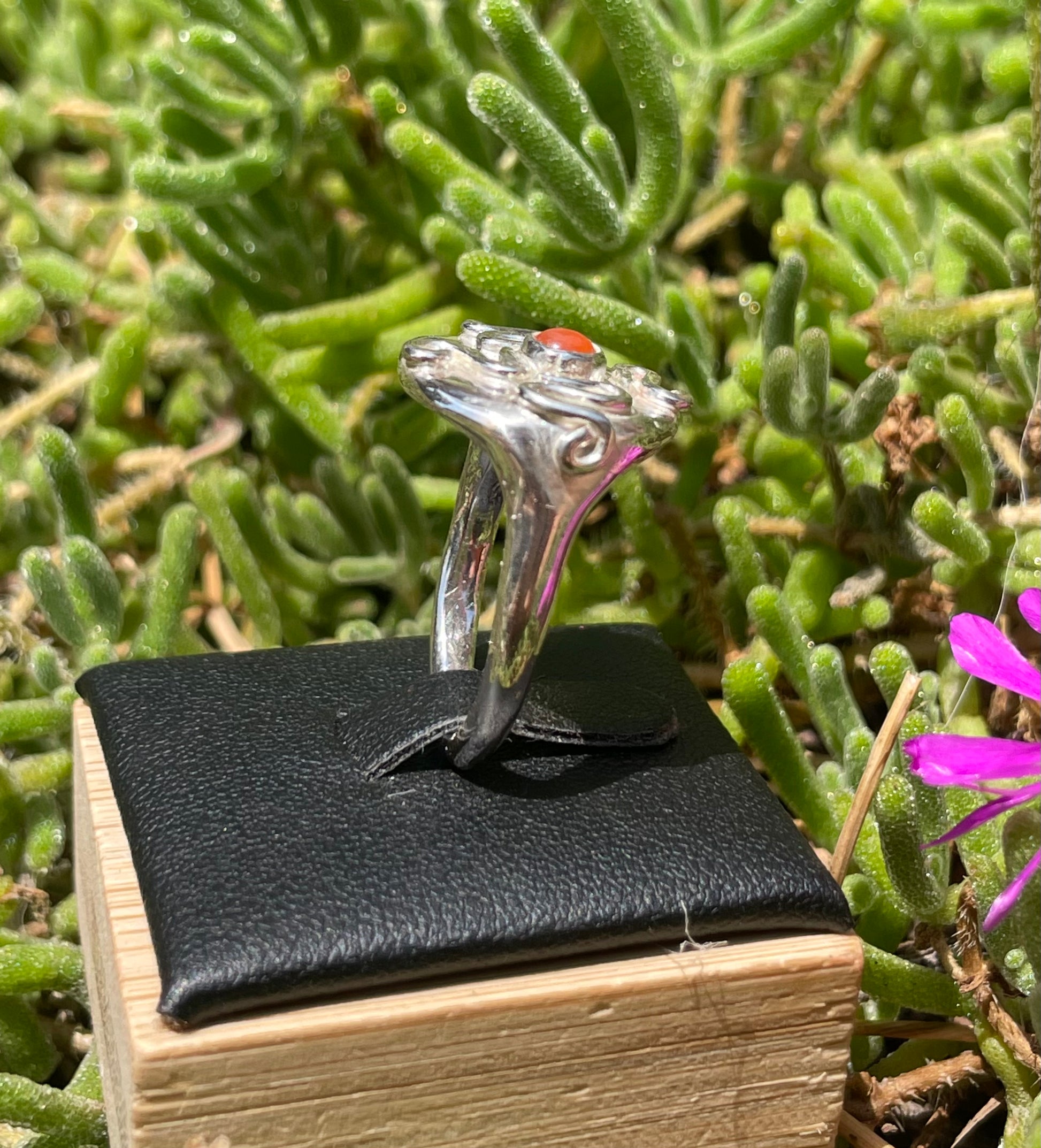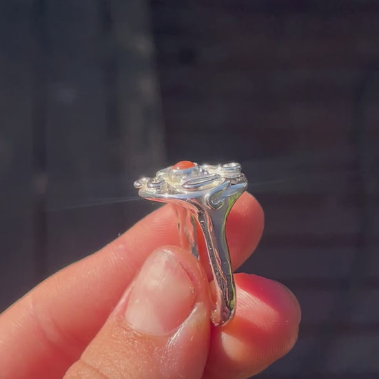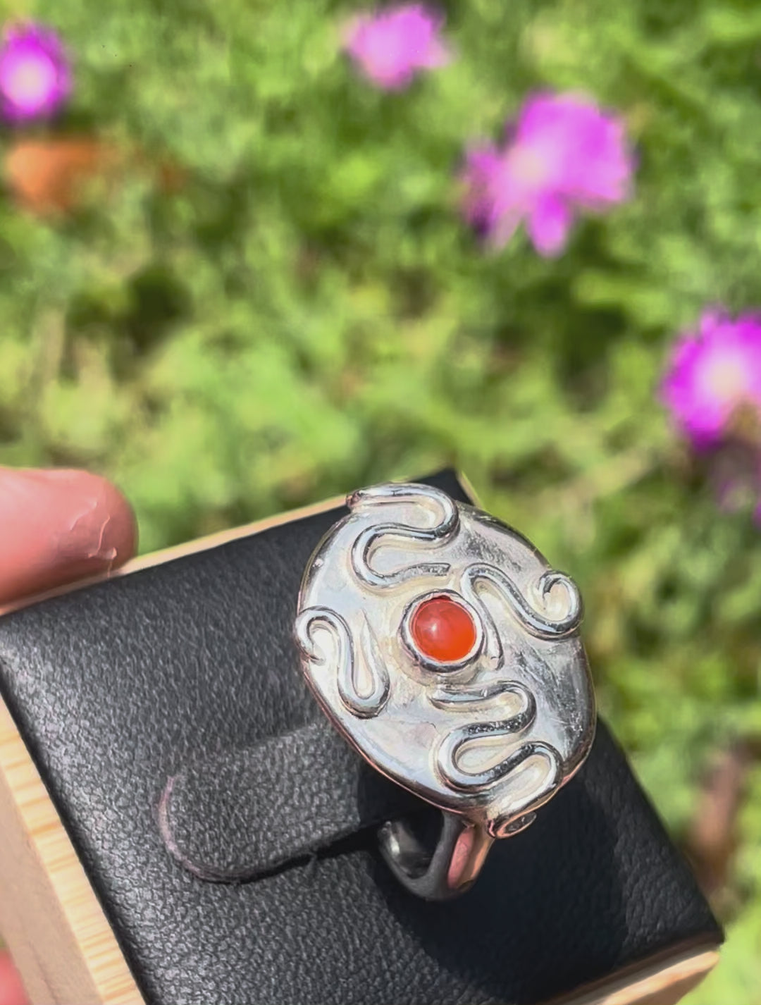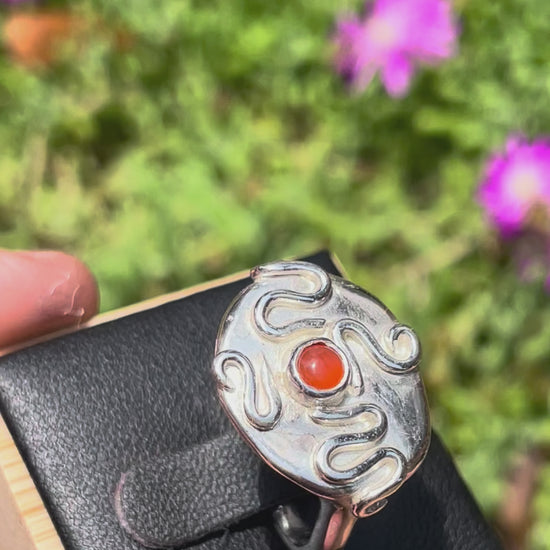 A handcrafted sterling silver ring featuring a rich carnelian stone at its centre. Handcrafted in solid 925 sterling silver.