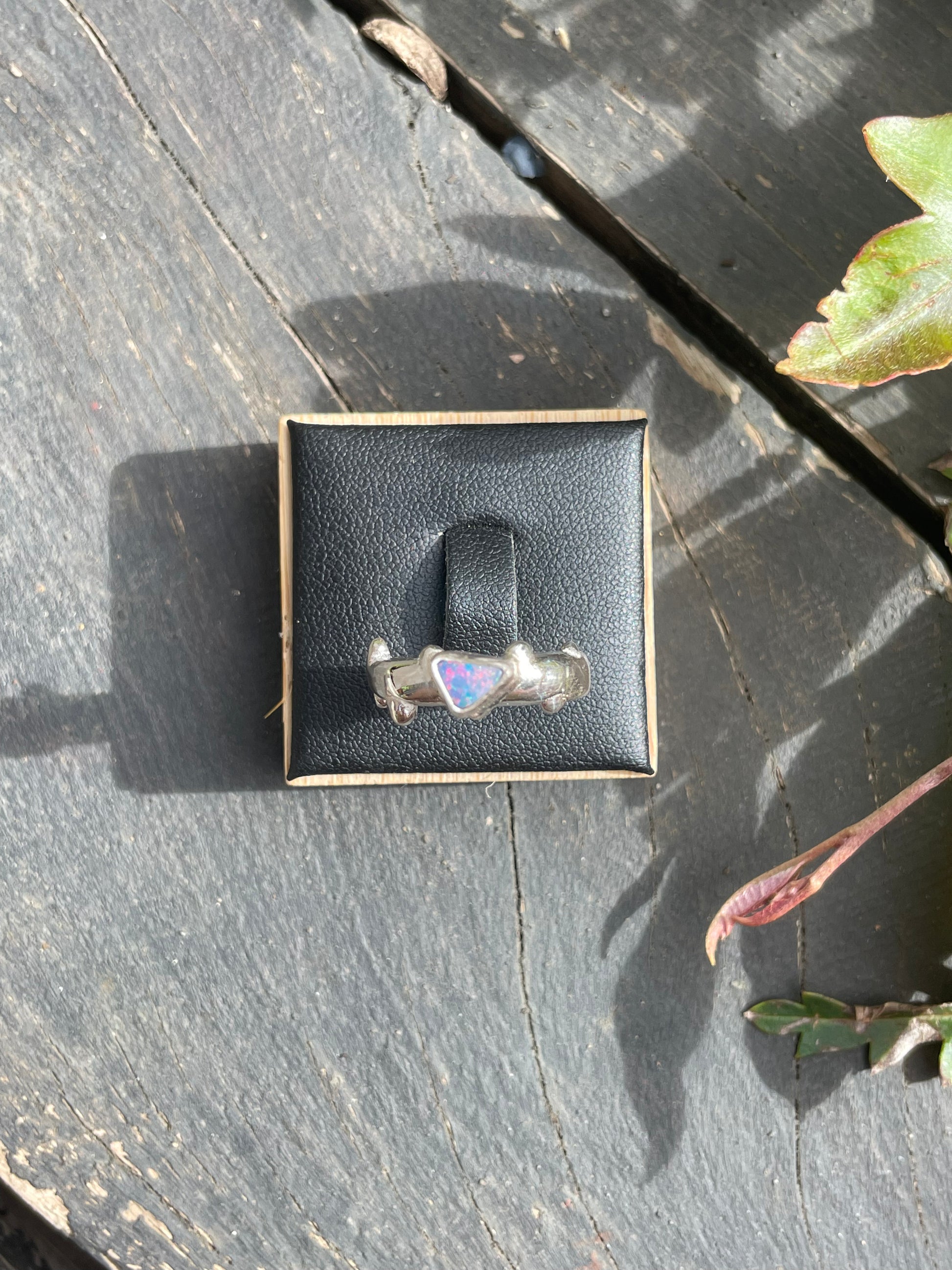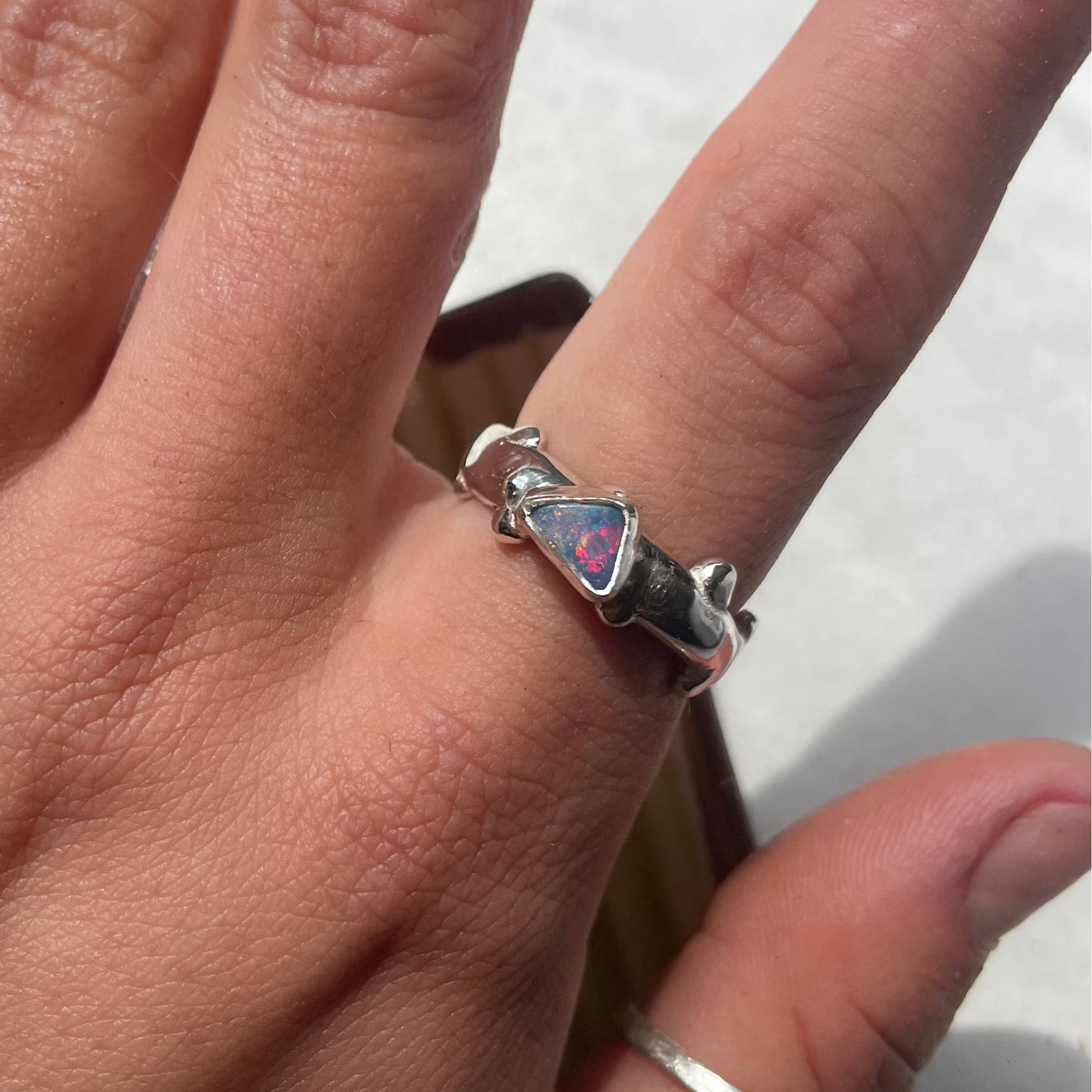 Stunning opal that catches the light in the most stunning ways, creating flashes of different colours. set on a sterling silver band with little ball details along the edges of the ring