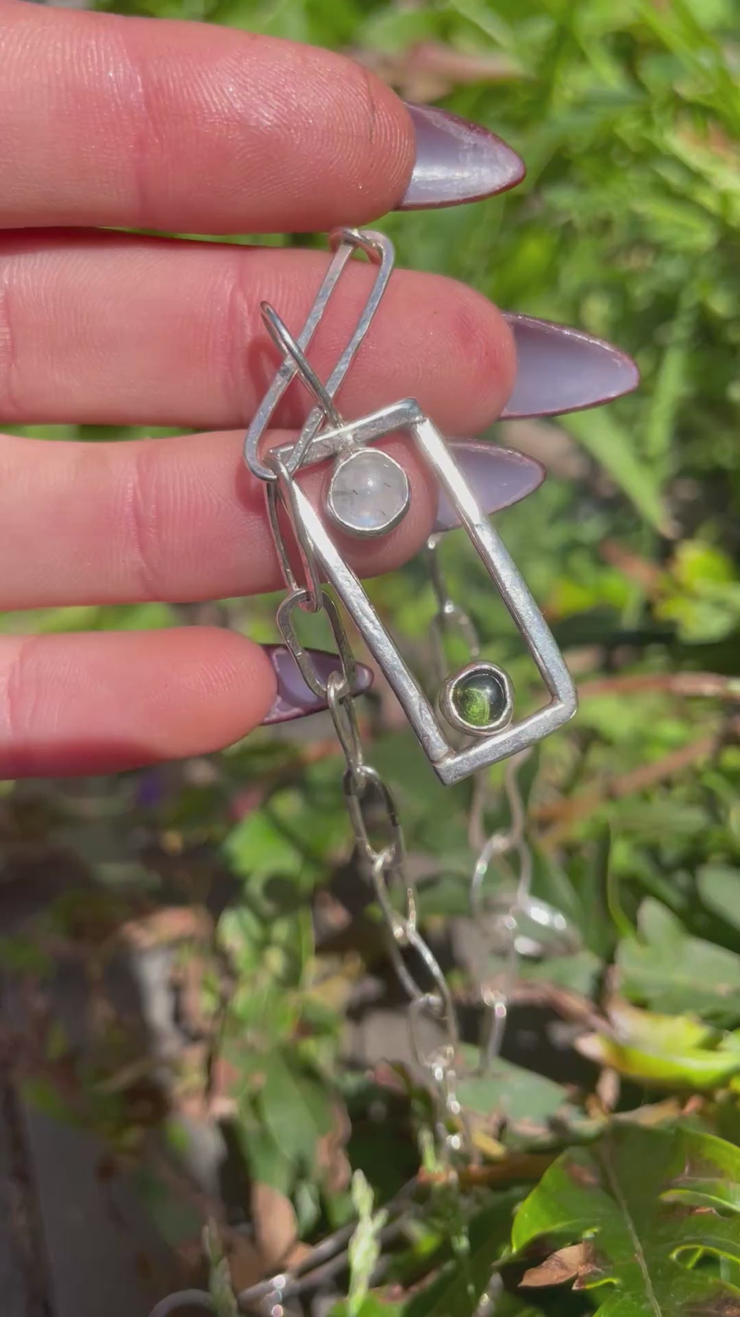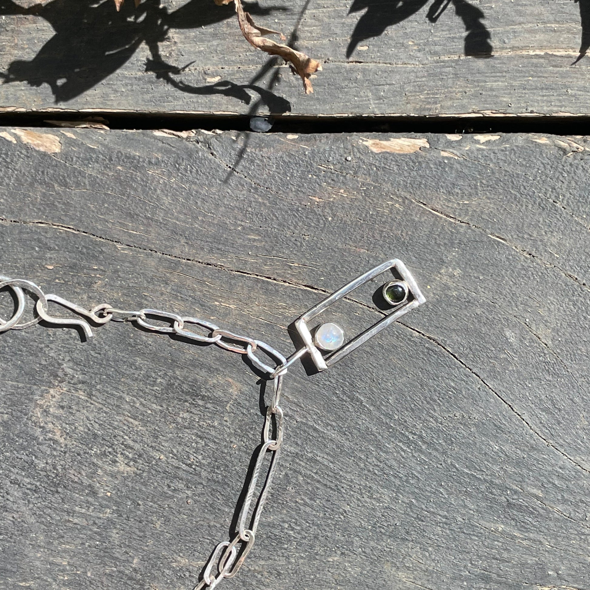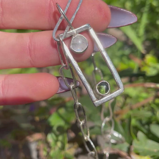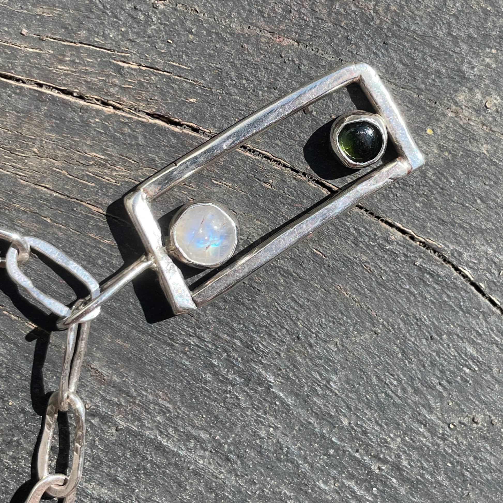 This pendant brings two powerful energies together in one refined design. A luminous moonstone sits at the top, glowing with intuitive, calming light, while a grounding tourmaline anchors the bottom half of the piece. Set within a handcrafted rectangular silver frame, the contrast between the stones creates a beautiful balance — softness above, strength below. It’s a piece made to carry intention, harmony, and quiet power wherever it goes.