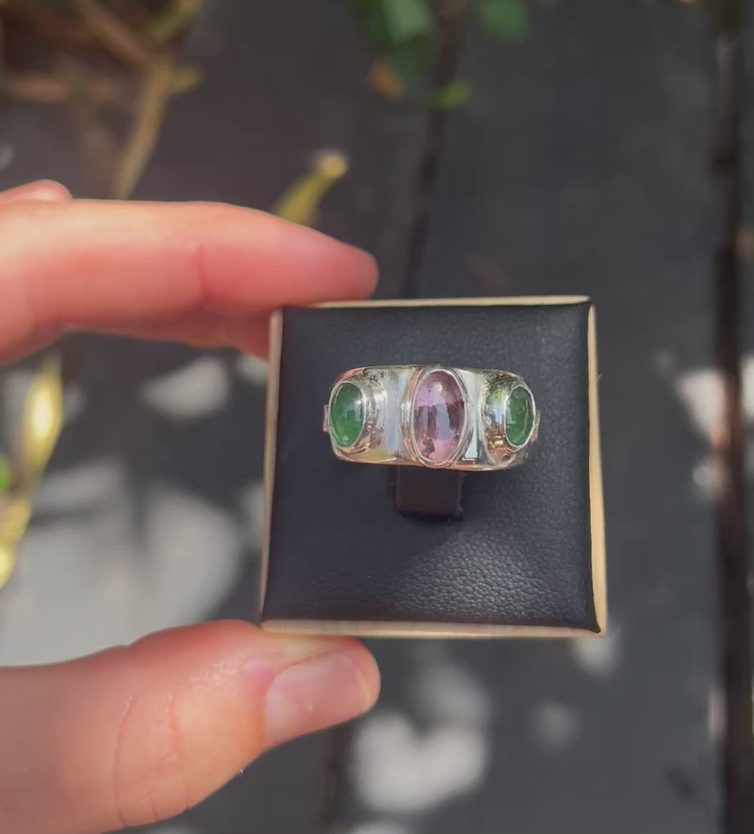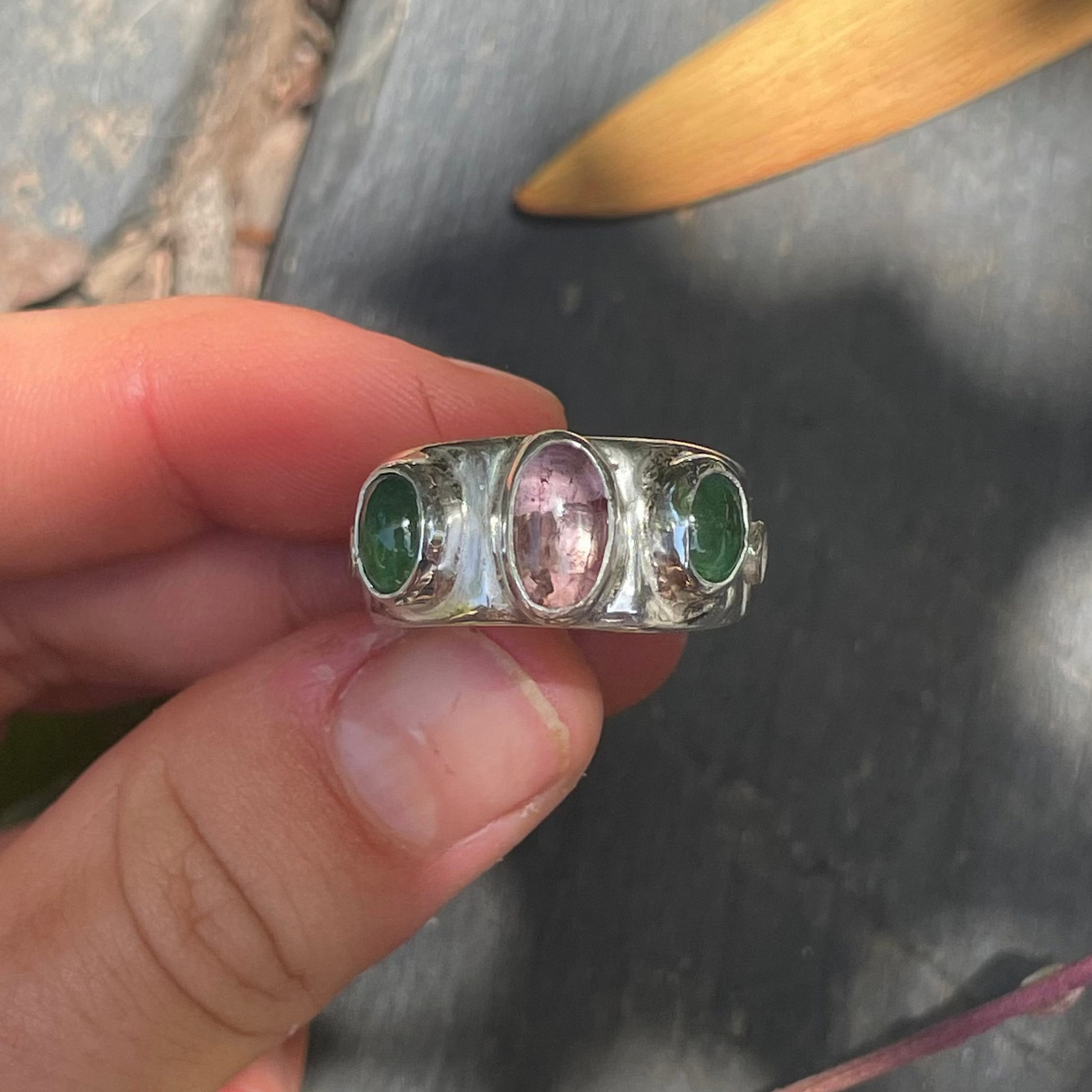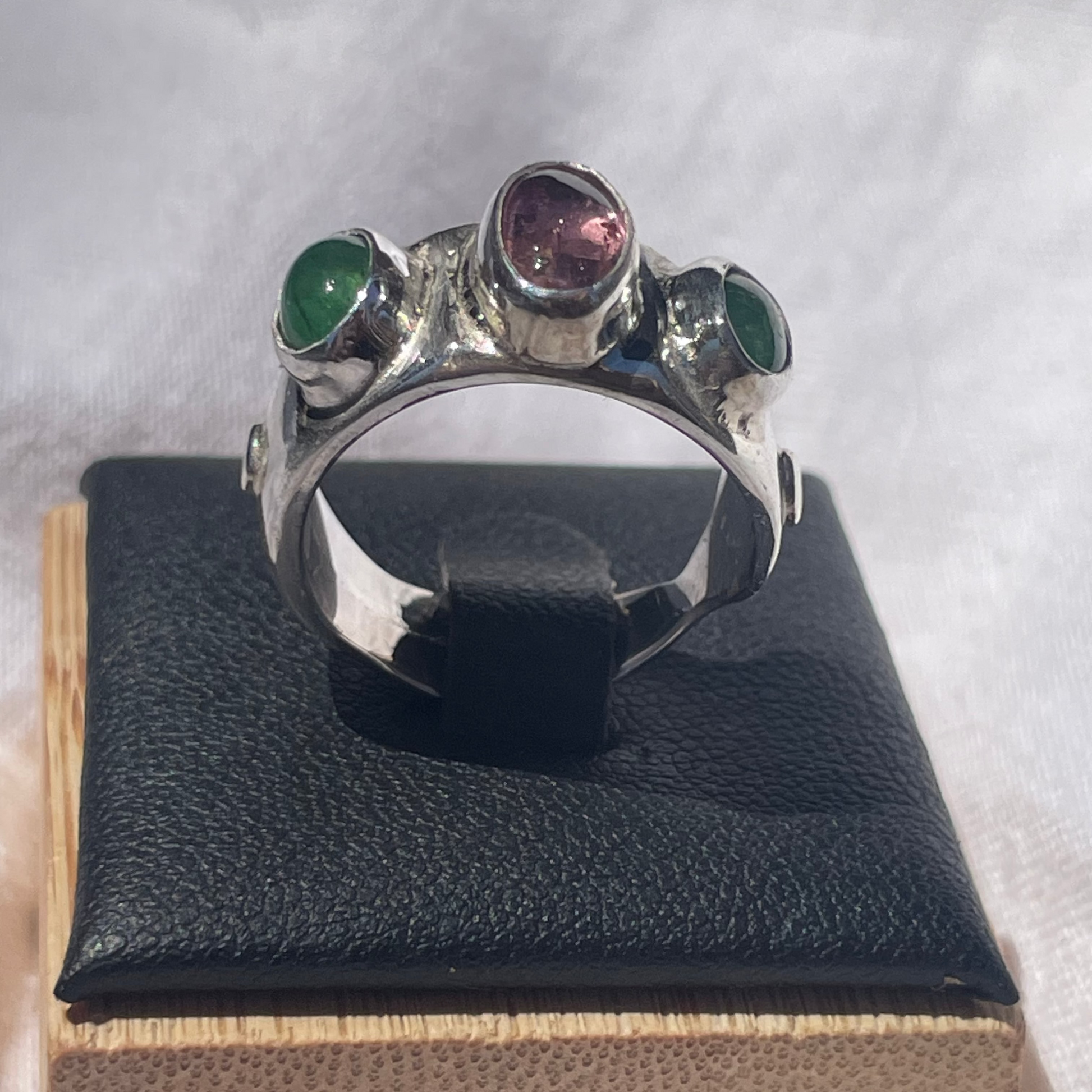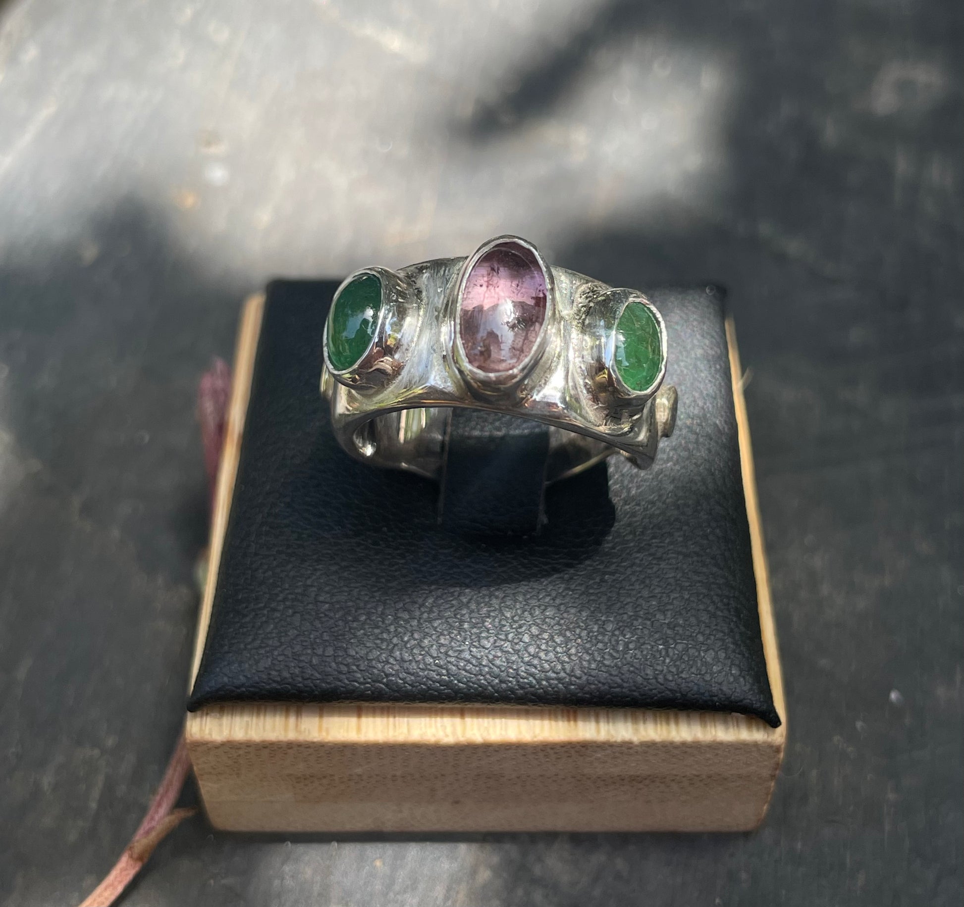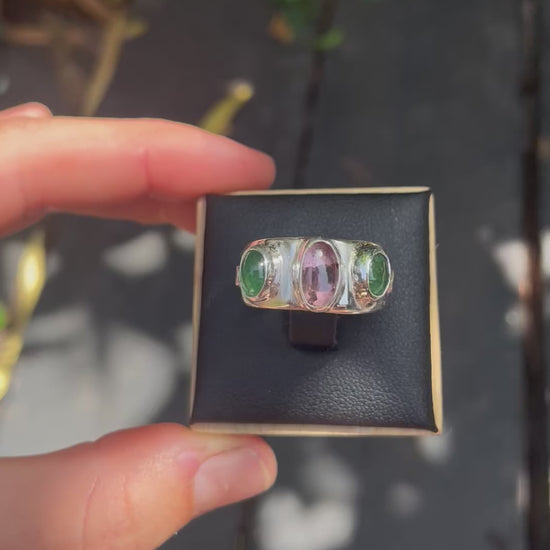Beautiful pink tourmaline sandwiched between two vibrant emeralds.