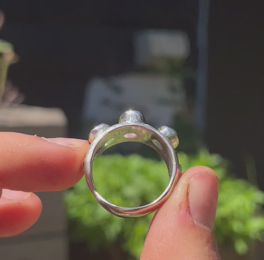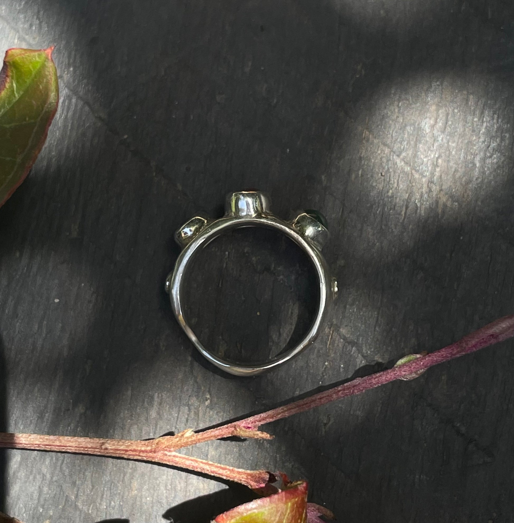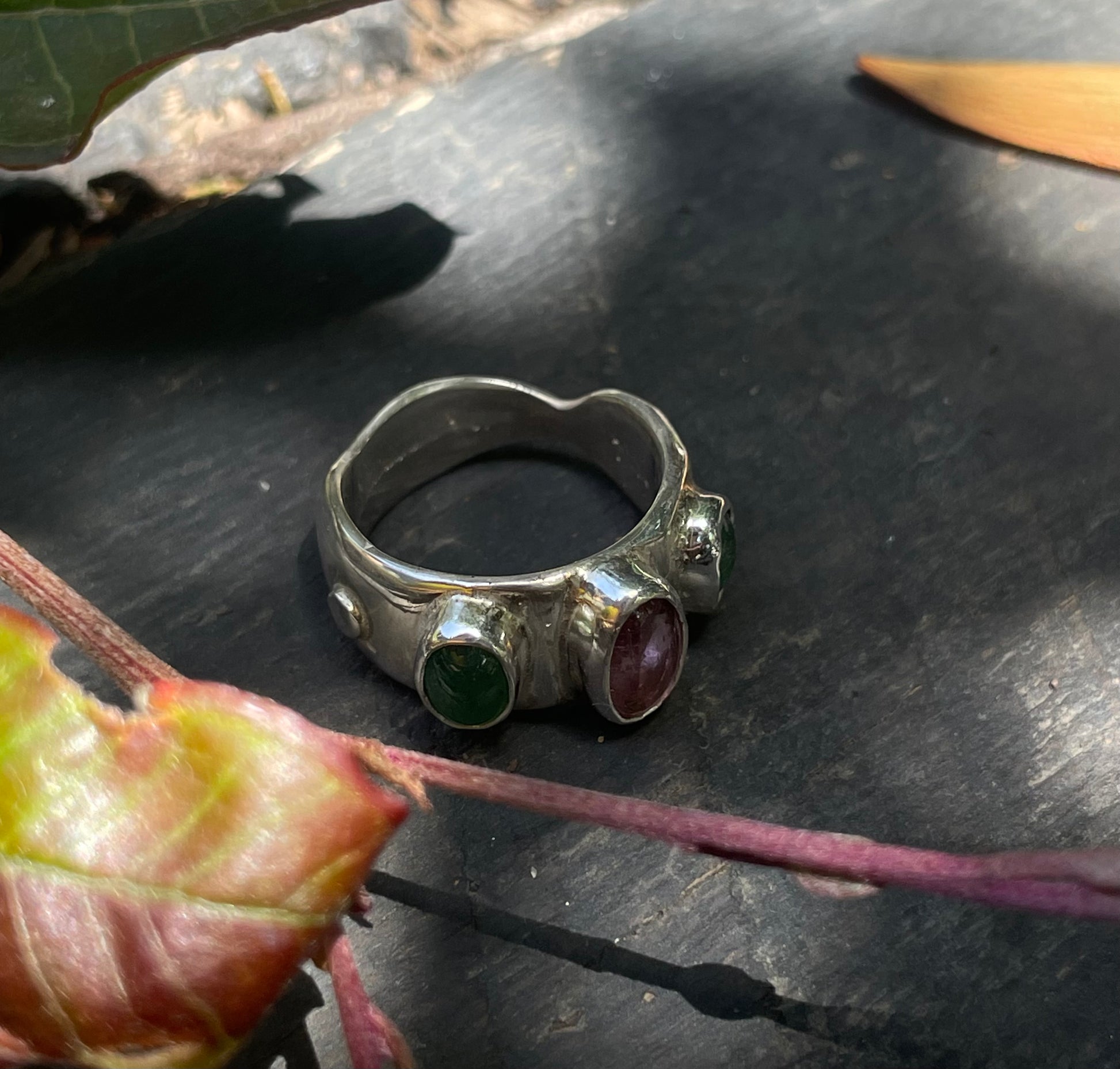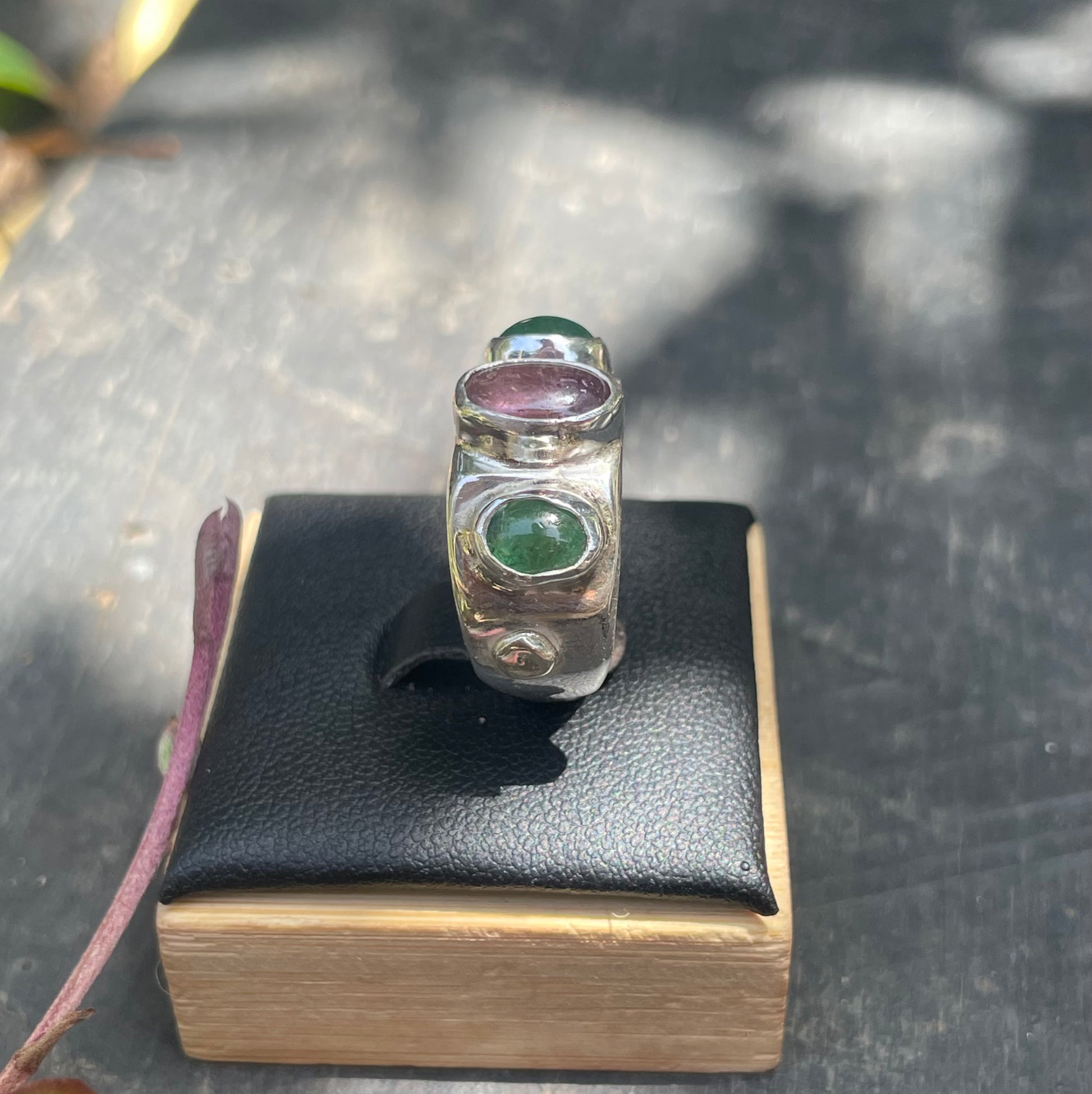 Beautiful pink tourmaline sandwiched between two vibrant emeralds.