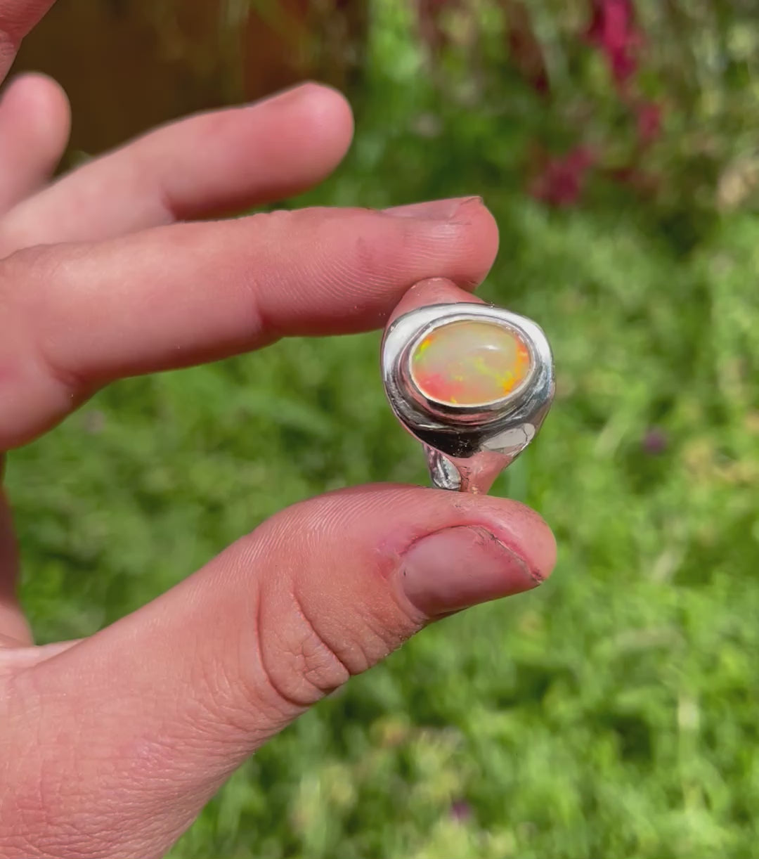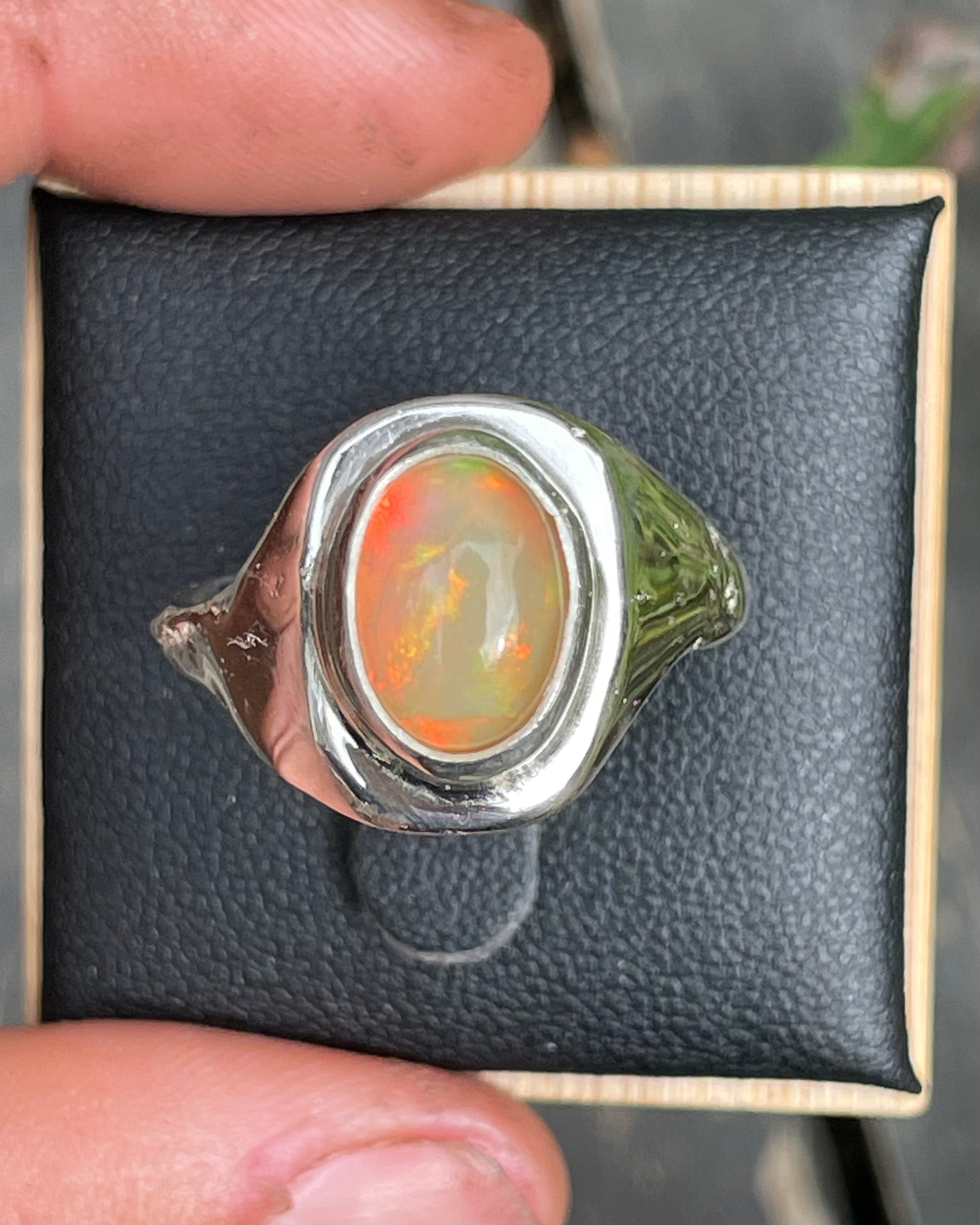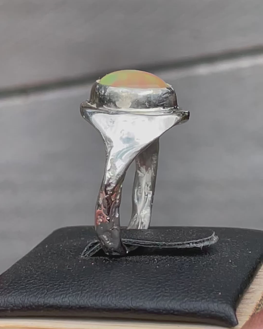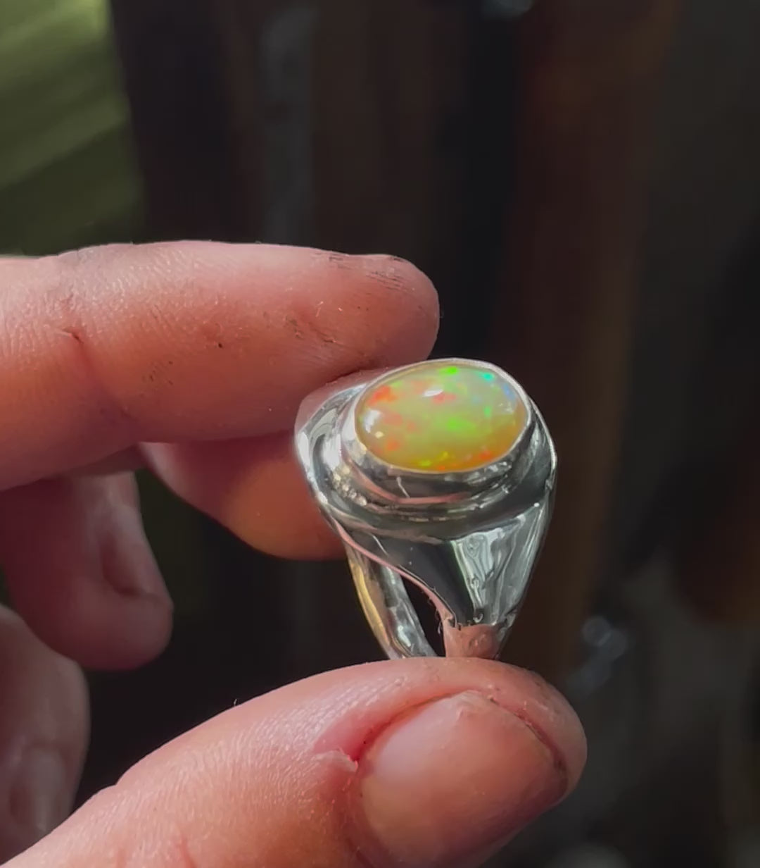 A striking Welo opal set into a fluid, sand-cast 925 sterling silver band. The organic, flowing form is designed to move with the stone, allowing the opal’s natural fire to take centre stage.