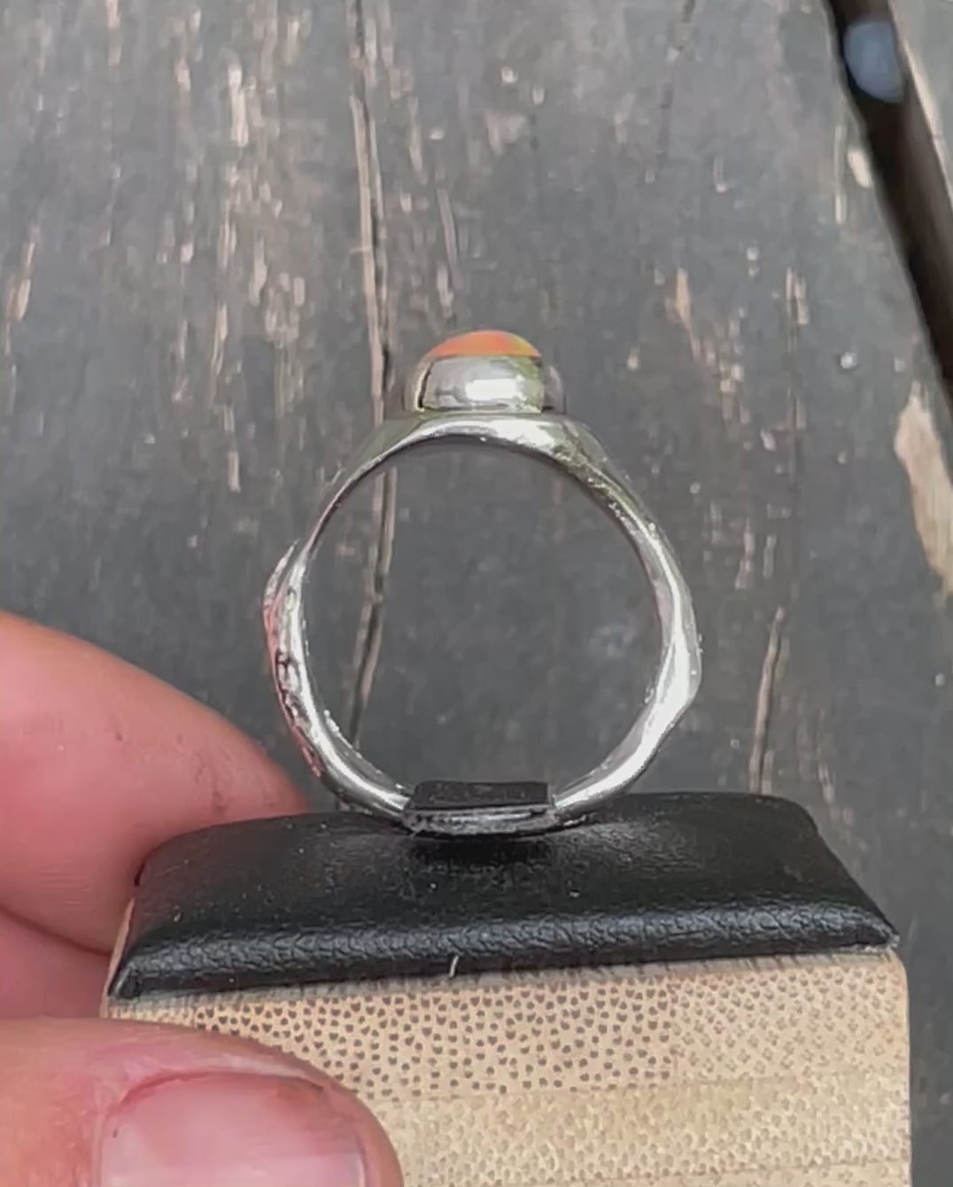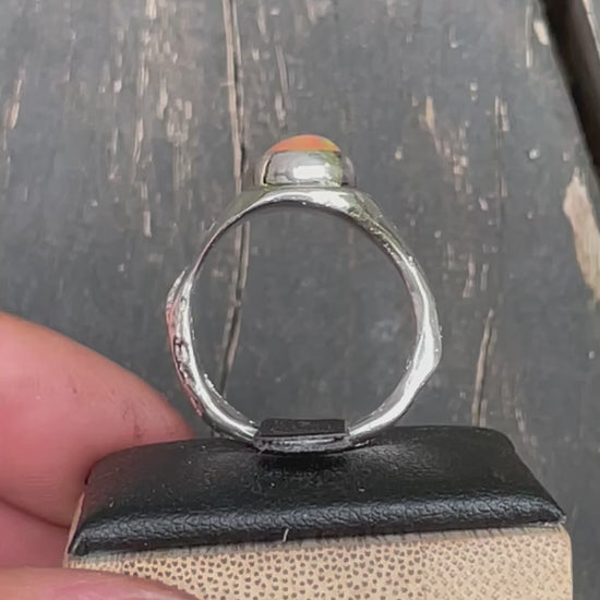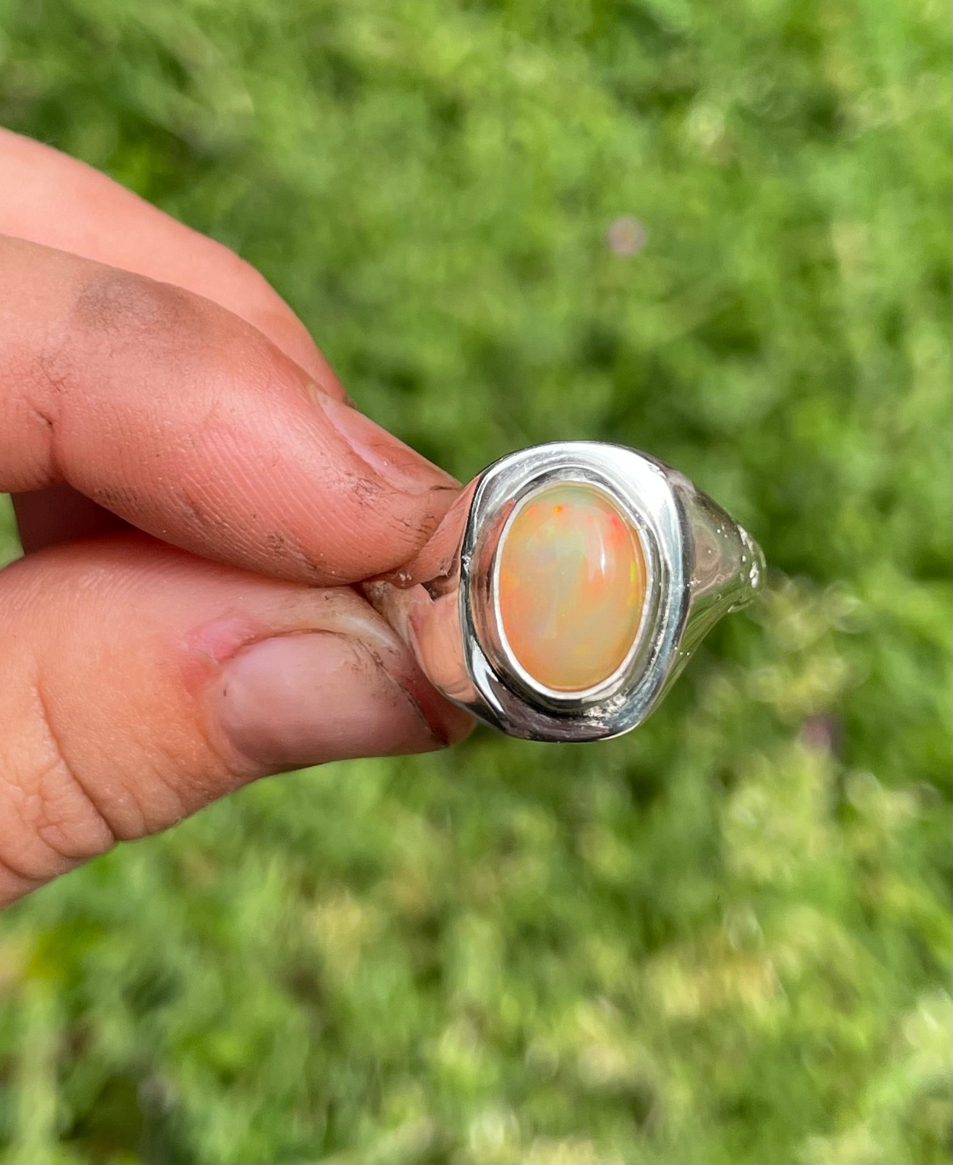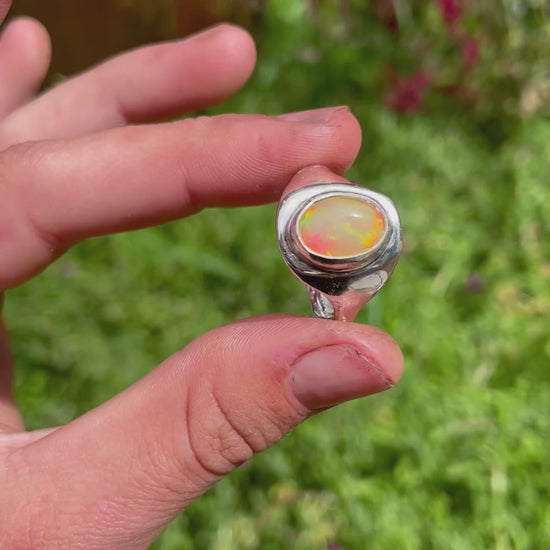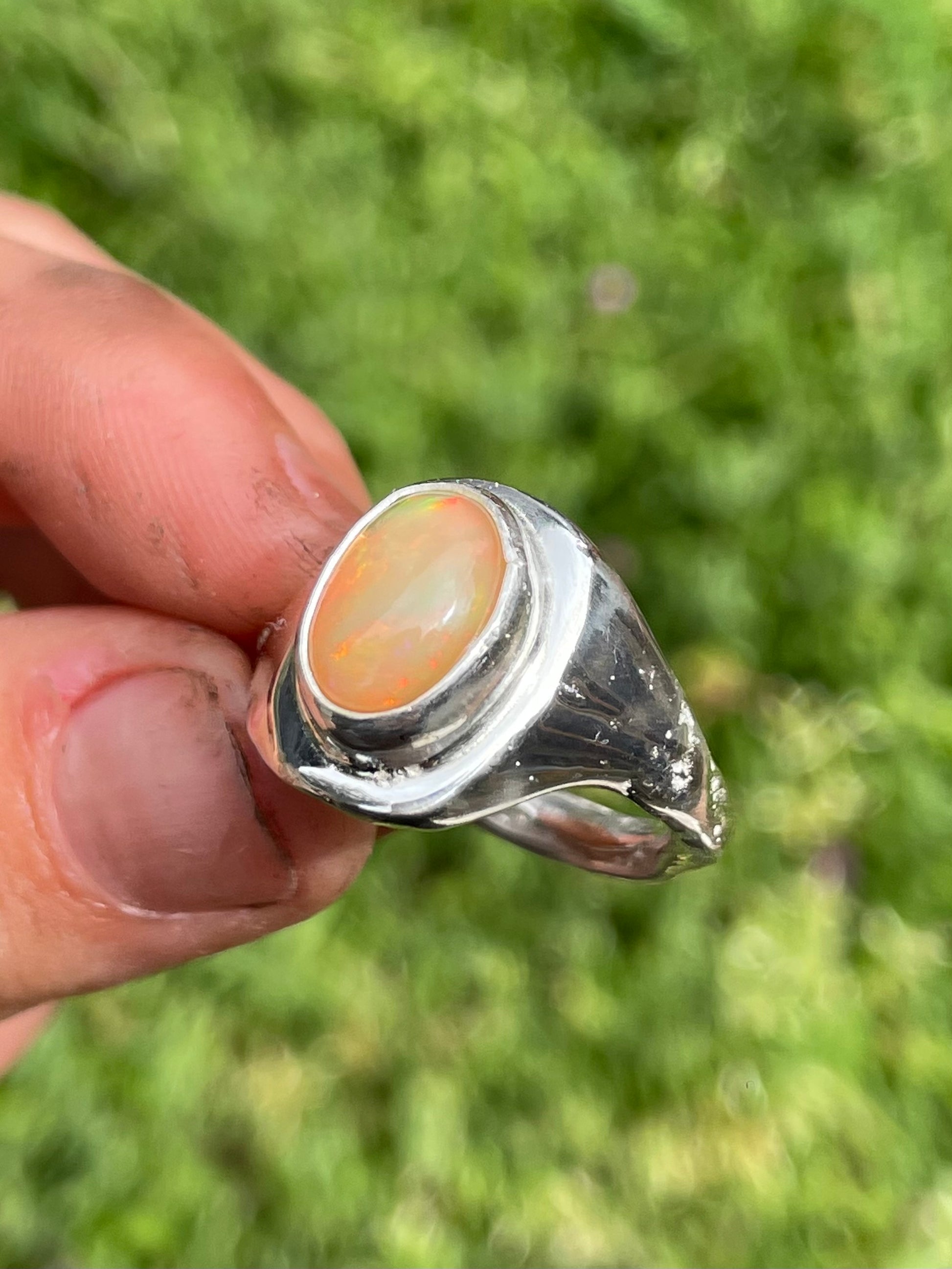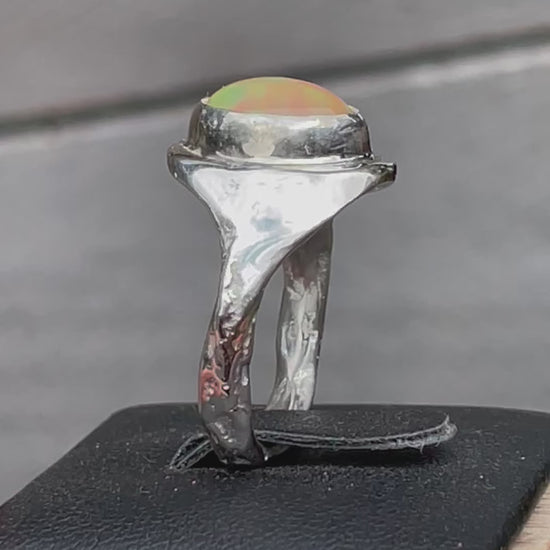 A striking Welo opal set into a fluid, sand-cast 925 sterling silver band. The organic, flowing form is designed to move with the stone, allowing the opal’s natural fire to take centre stage.