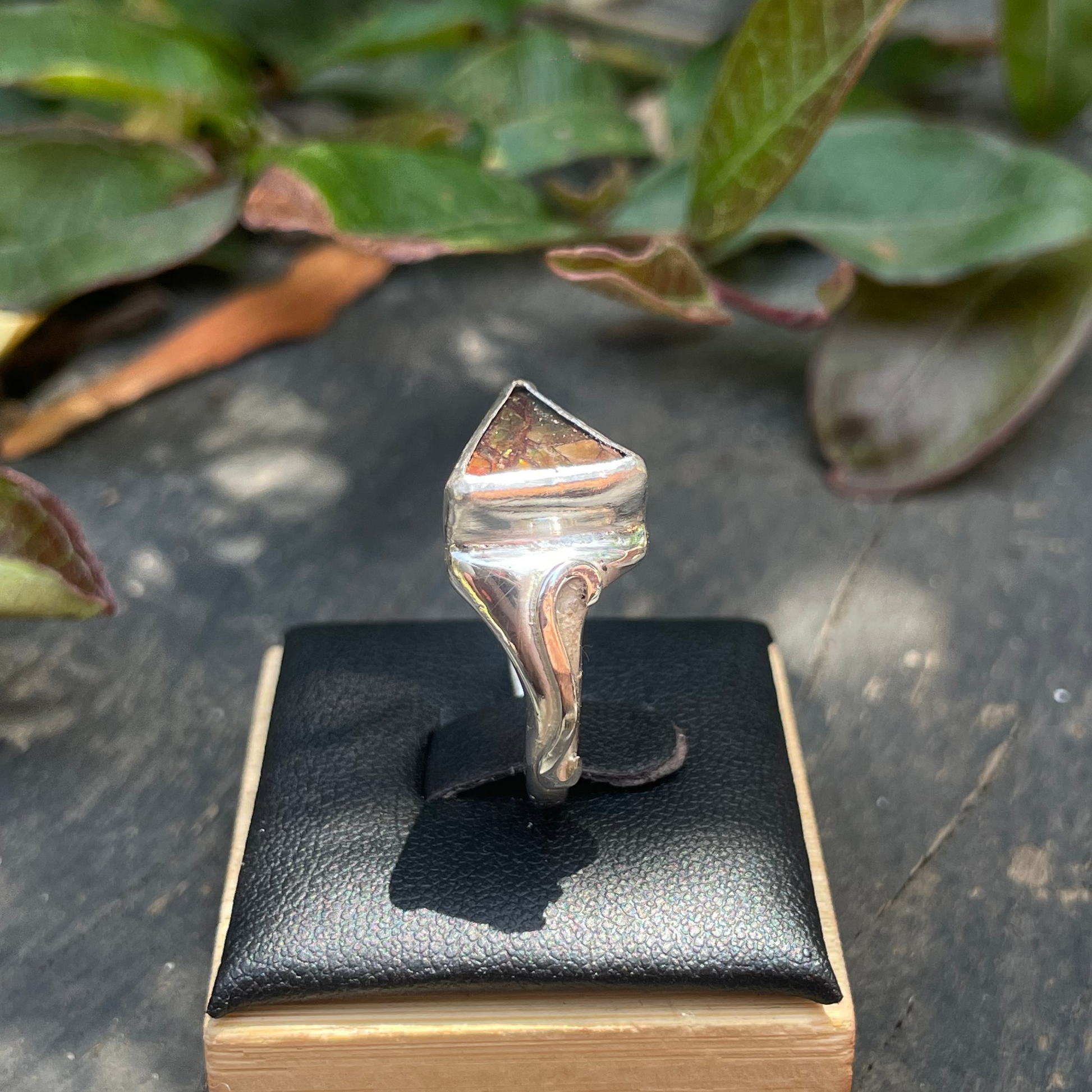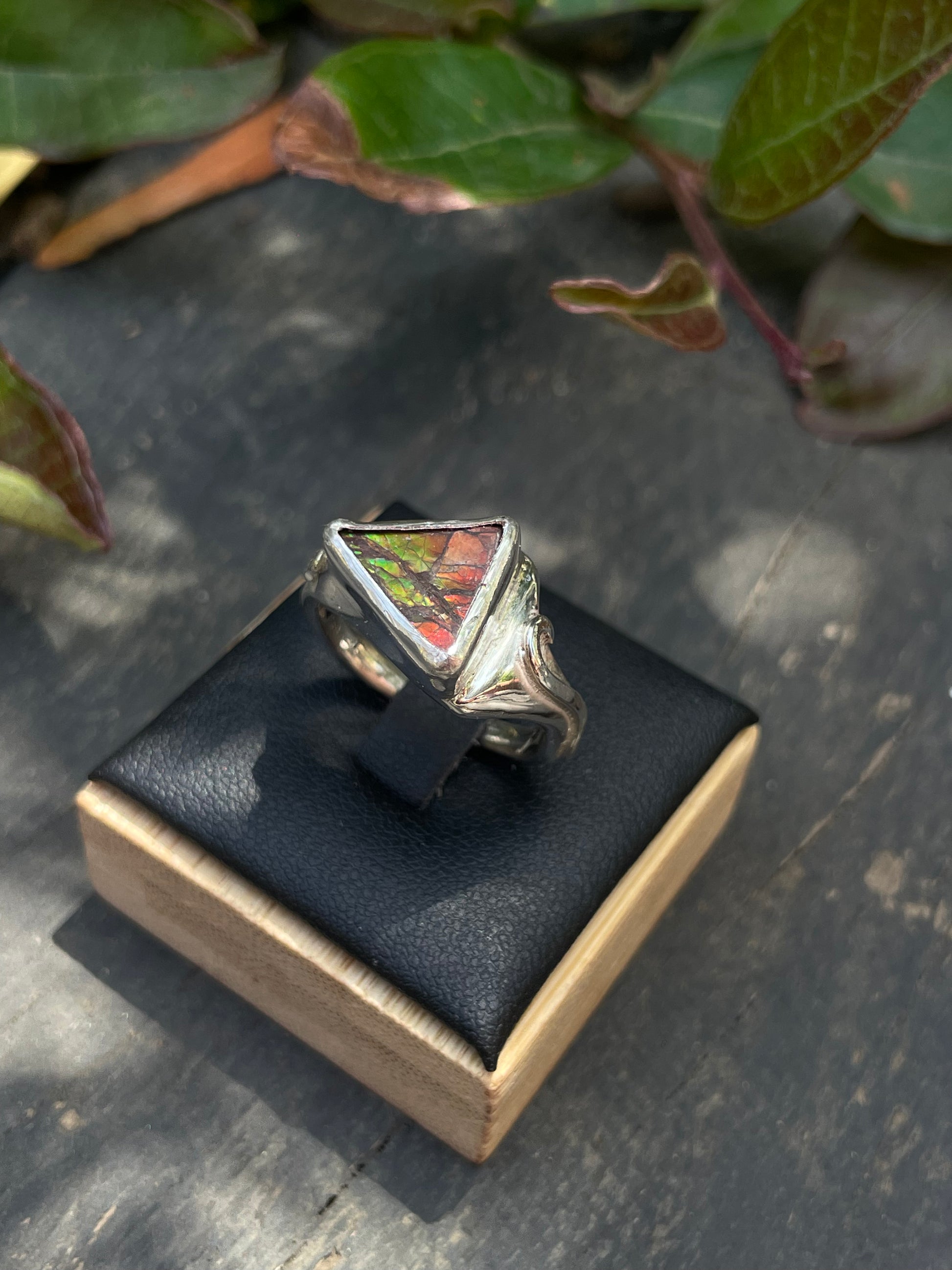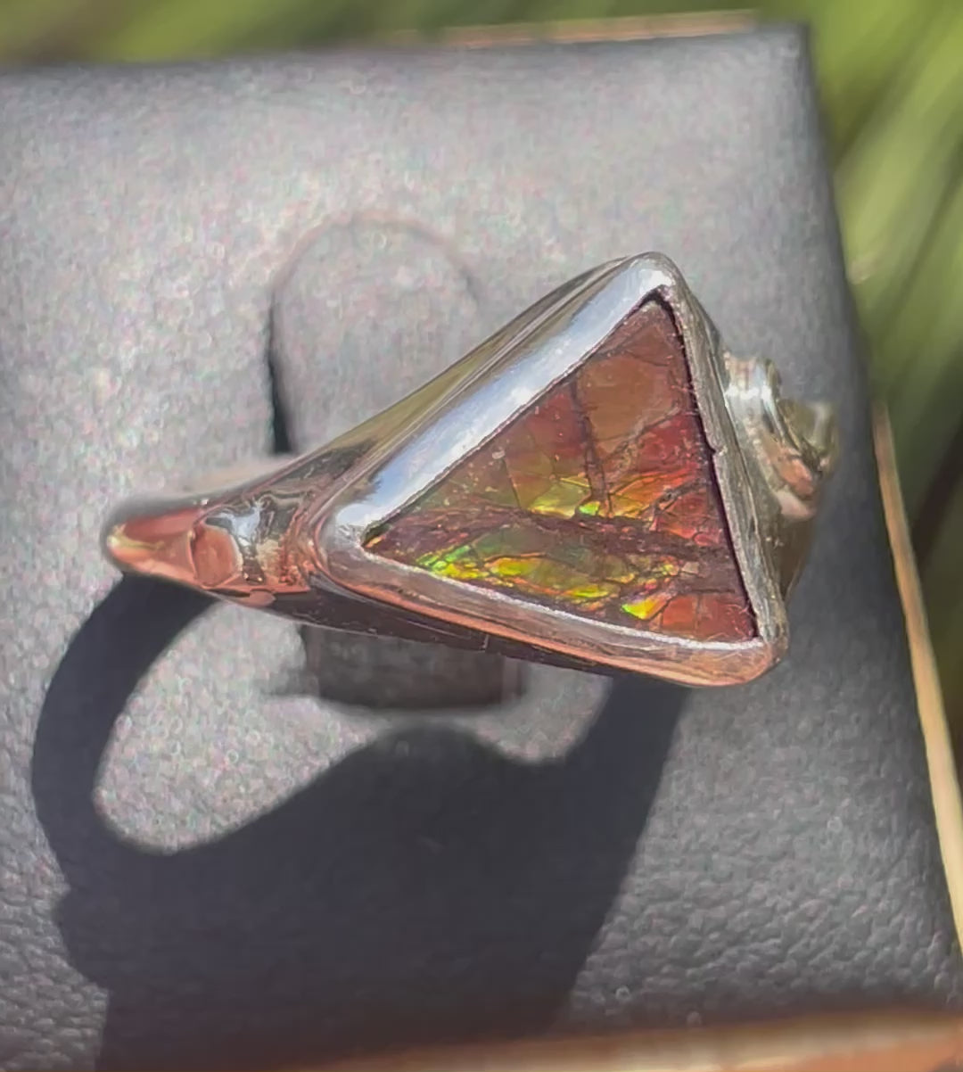Stunning ammolite that flickers red, orange and yellow in different lighting. Set on a solid 925 sterling silver band.