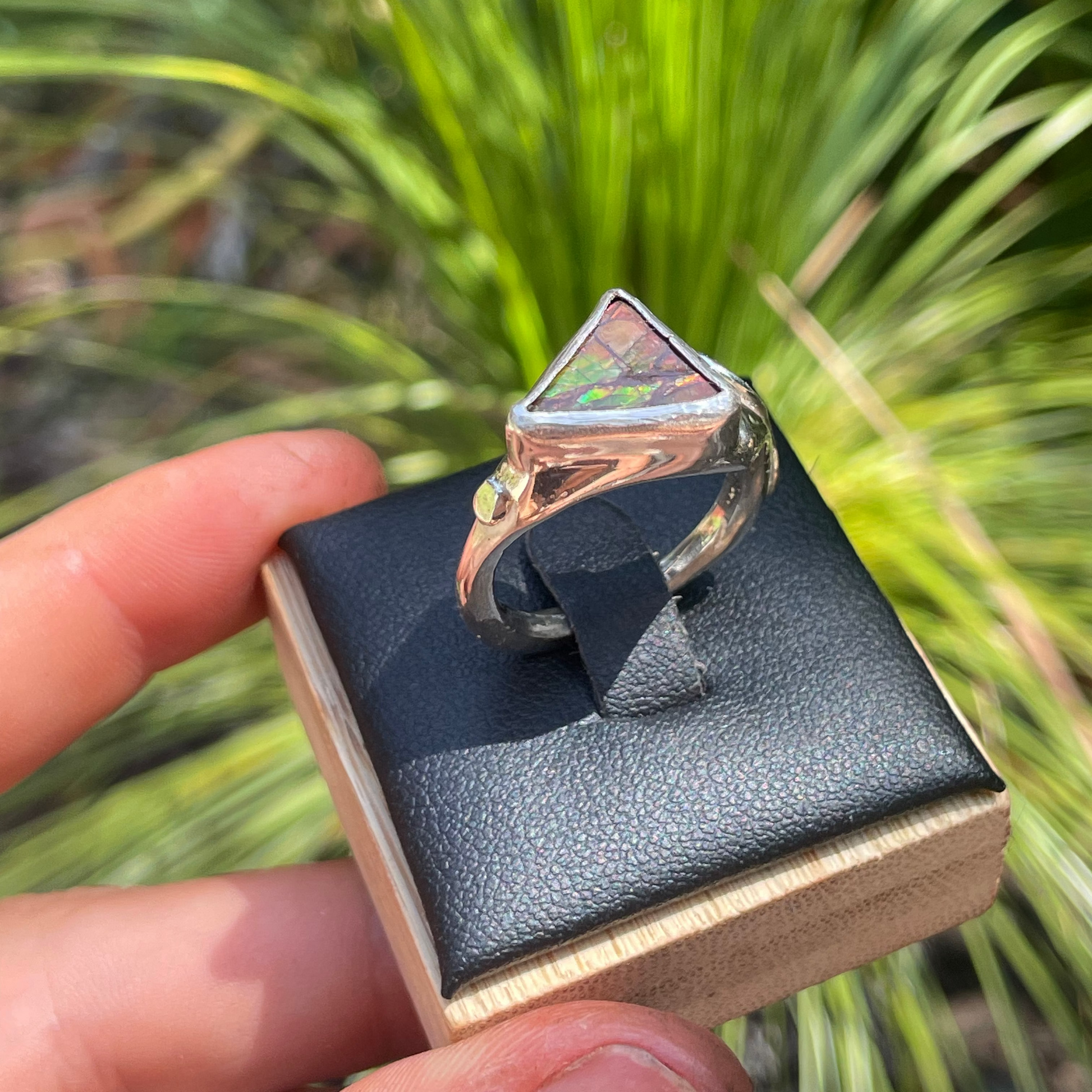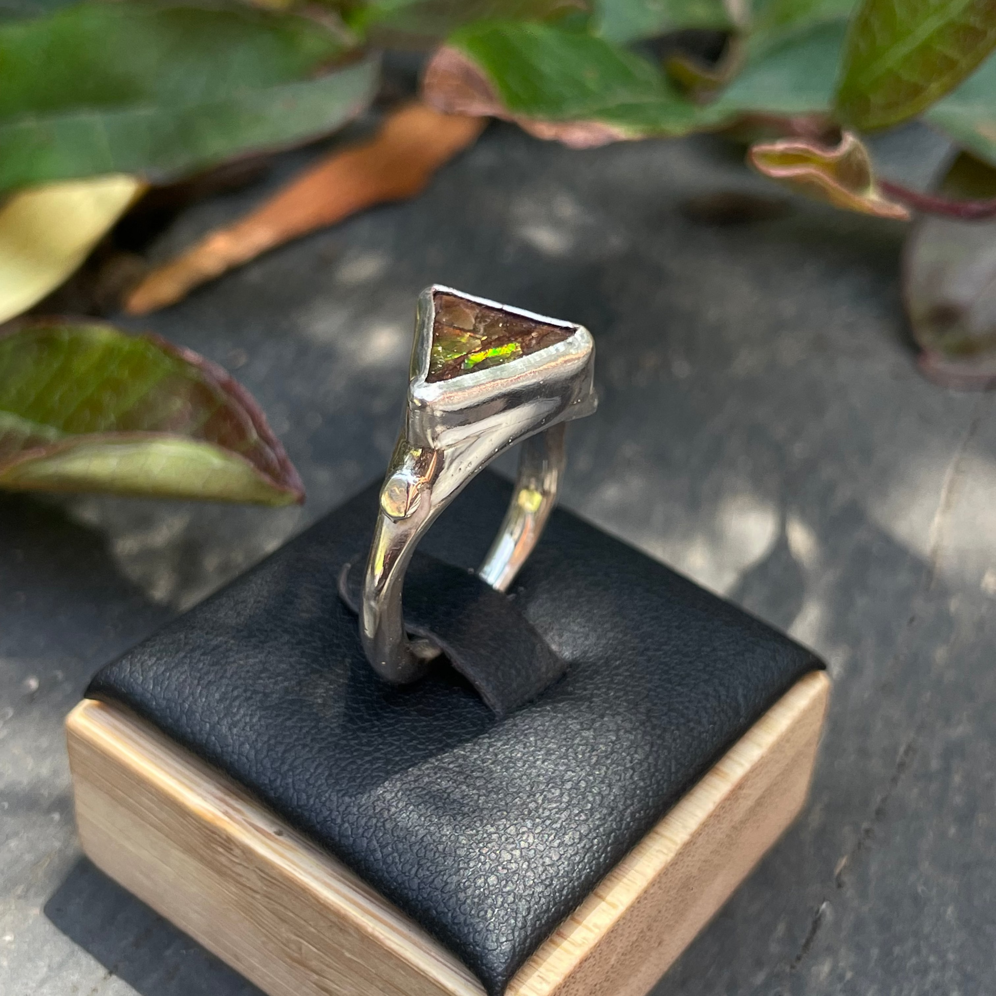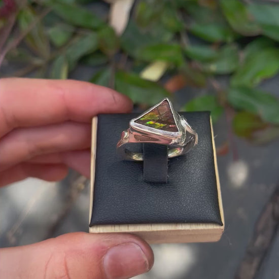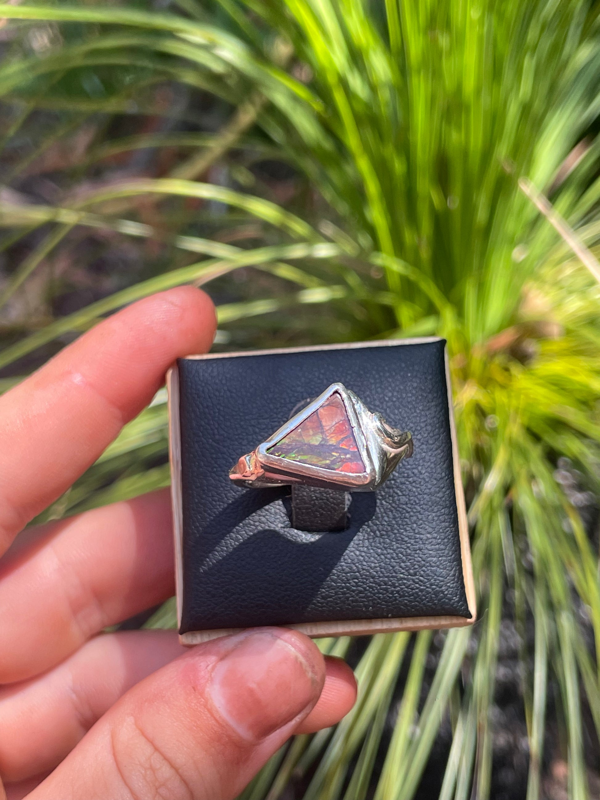 Stunning ammolite that flickers red, orange and yellow in different lighting. Set on a solid 925 sterling silver band.